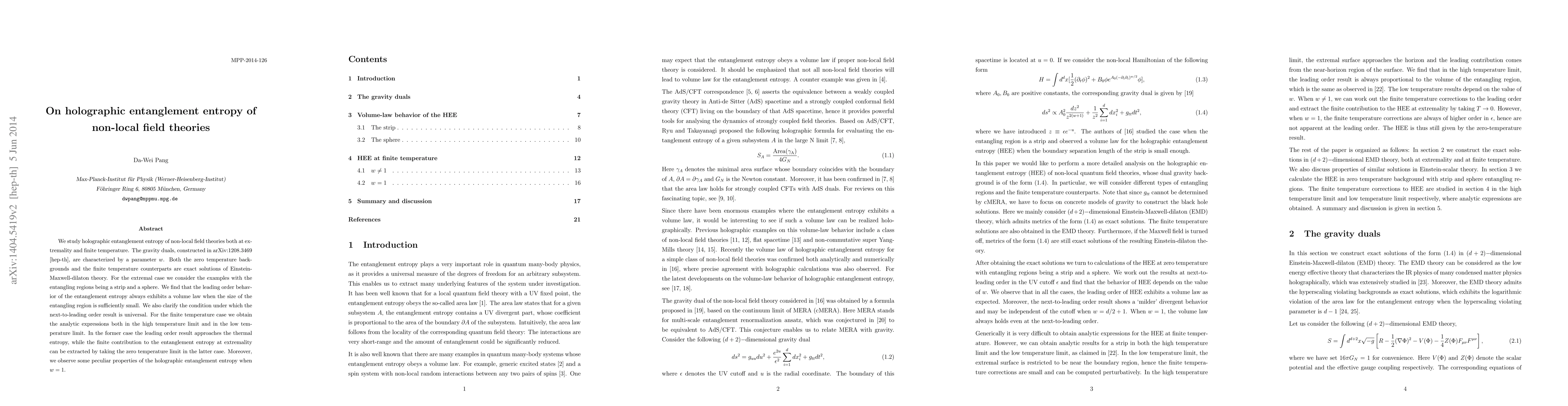 This paper examines the holographic entanglement entropy in non-local field theories at both extremality and finite temperature, revealing volume law behavior for small entangling regions and providing analytic expressions for high and low temperature limits. Special attention is given to the parameter $w$ and its effects on entanglement entropy.