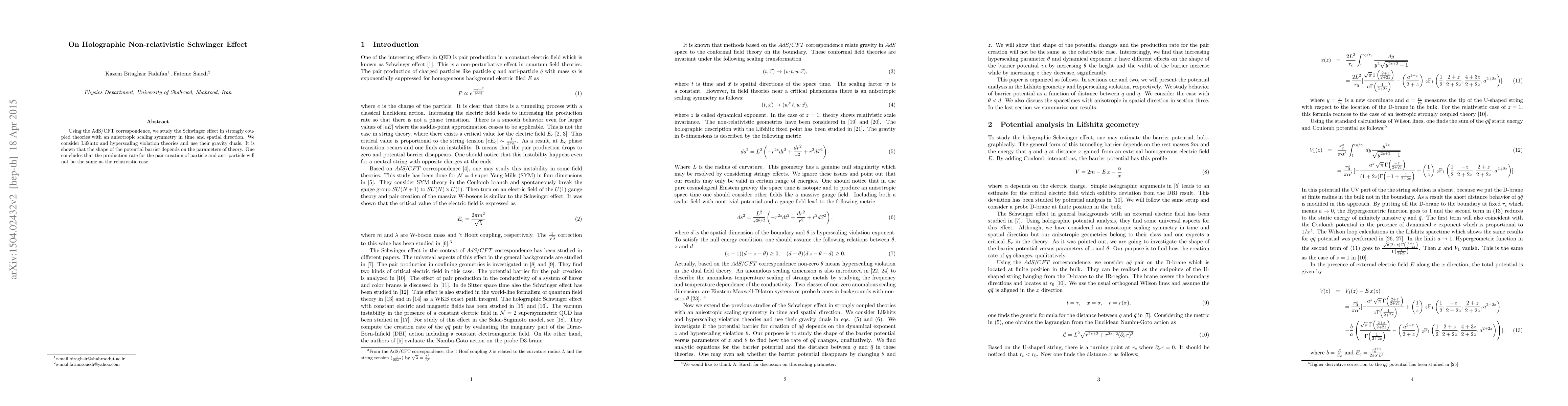 Using the AdS/CFT correspondence, we study the Schwinger effect in strongly coupled theories with an anisotropic scaling symmetry in time and spatial direction. We consider Lifshitz and hyperscaling violation theories and use their gravity duals. It is shown that the shape of the potential barrier depends on the parameters of theory. One concludes that the production rate for the pair creation of particle and anti-particle will not be the same as the relativistic case.