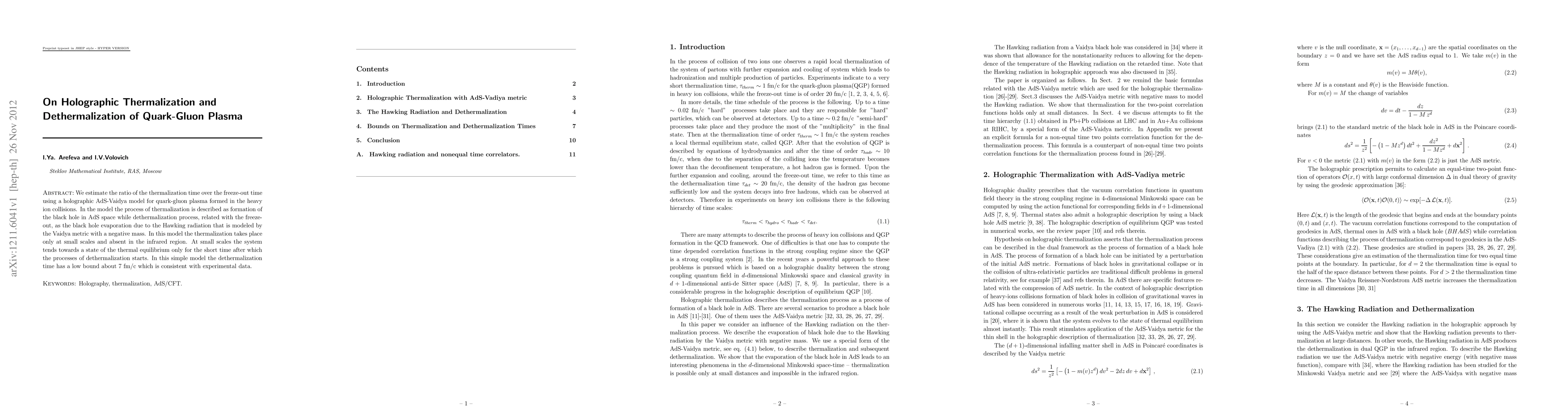 We estimate the ratio of the thermalization time over the freeze-out time using a holographic AdS-Vaidya model for quark-gluon plasma formed in the heavy ion collisions. In the model the process of thermalization is described as formation of the black hole in AdS space while dethermalization process, related with the freeze-out, as the black hole evaporation due to the Hawking radiation that is modeled by the Vaidya metric with a negative mass. In this model the thermalization takes place only at small scales and absent in the infrared region. At small scales the system tends towards a state of the thermal equilibrium only for the short time after which the processes of dethermalization starts. In this simple model the dethermalization time has a low bound about 7 fm/c which is consistent with experimental data.