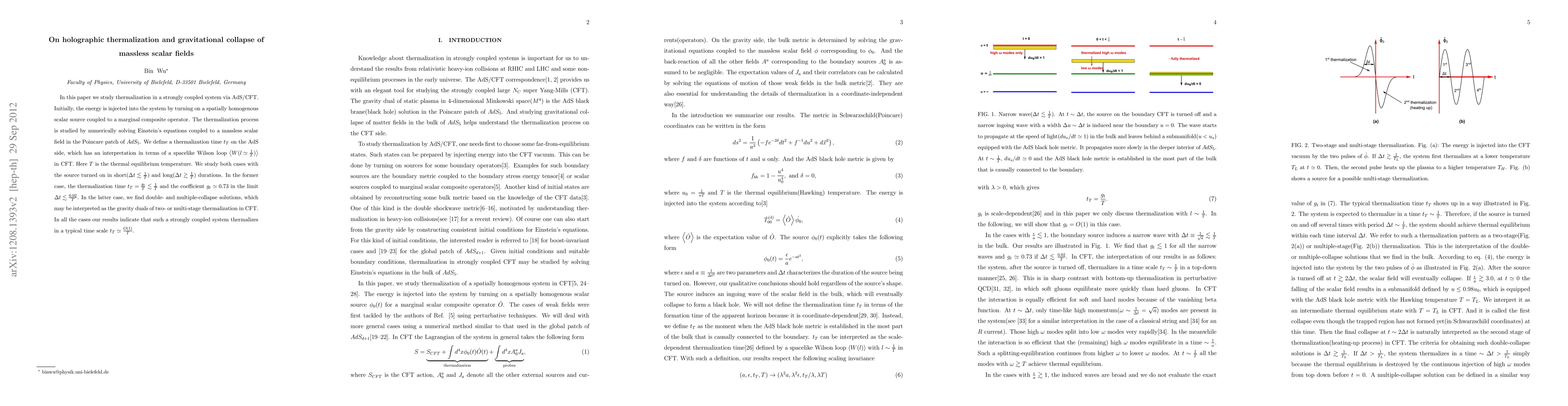 This paper investigates thermalization in strongly coupled systems using AdS/CFT, focusing on the gravitational collapse of massless scalar fields. It finds that thermalization occurs within a time scale t_T=O(1)/T, with different behaviors depending on the duration of the energy injection.