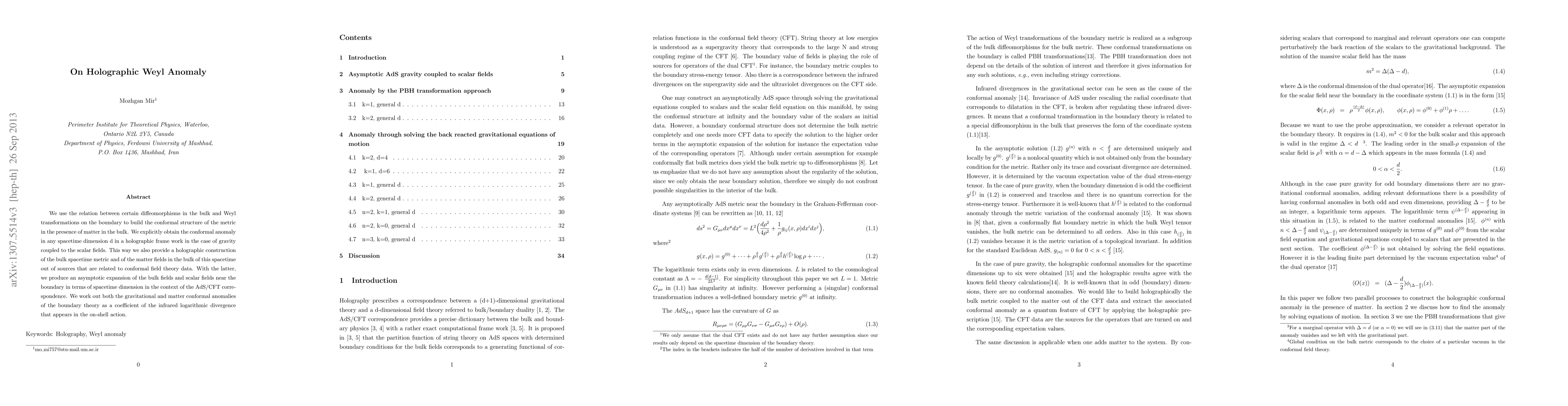 We use the relation between certain diffeomorphisms in the bulk and Weyl transformations on the boundary to build the conformal structure of the metric in the presence of matter in the bulk. We explicitly obtain the conformal anomaly in any spacetime dimension d in a holographic frame work in the case of gravity coupled to the scalar fields. This way we also provide a holographic construction of the bulk spacetime metric and of the matter fields in the bulk of this spacetime out of sources that are related to conformal field theory data. With the latter, we produce an asymptotic expansion of the bulk fields and scalar fields near the boundary in terms of spacetime dimension in the context of the AdS/CFT correspondence. We work out both the gravitational and matter conformal anomalies of the boundary theory as a coefficient of the infrared logarithmic divergence that appears in the on-shell action.