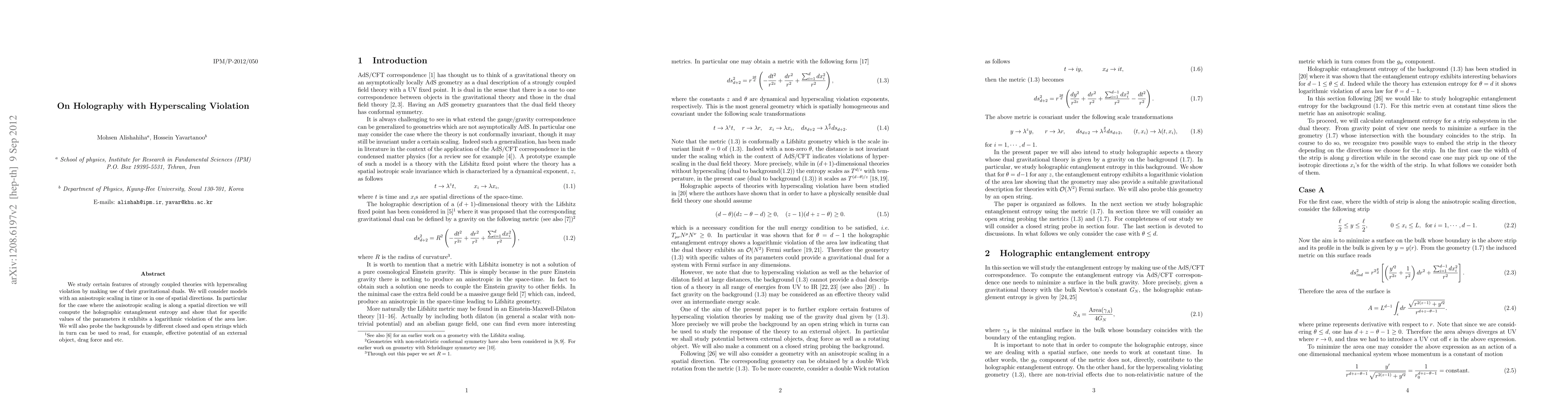 This paper investigates strongly coupled theories with hyperscaling violation using their gravitational duals, focusing on models with anisotropic scaling. It computes the holographic entanglement entropy, revealing a logarithmic violation of the area law for specific parameter values, and explores the backgrounds through closed and open strings to determine effective potentials and drag forces.