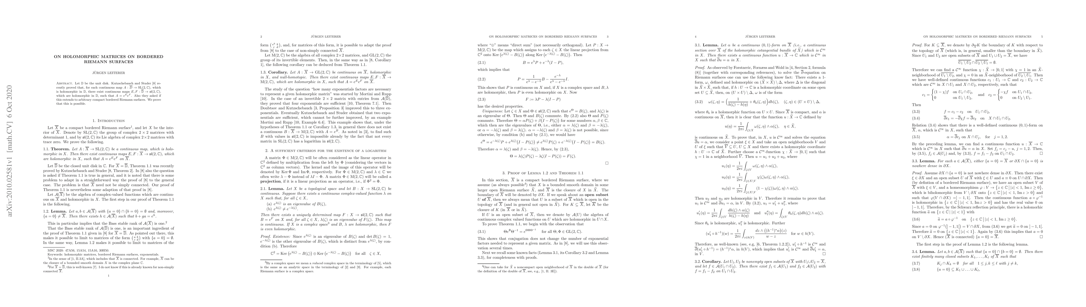 Let $\D$ be the unit disk. Kutzschebauch and Studer \cite{KS} recently proved that, for each continuous map $A:\overline D\to \mathrm{SL}(2,\C)$, which is holomorphic in $\D$, there exist continuous maps $E,F:\overline \D\to \mathfrak{sl}(2,\C)$, which are holomorphic in $\D$, such that $A=e^Ee^F$. Also they asked if this extends to arbitrary compact bordered Riemann surfaces. We prove that this is possible.