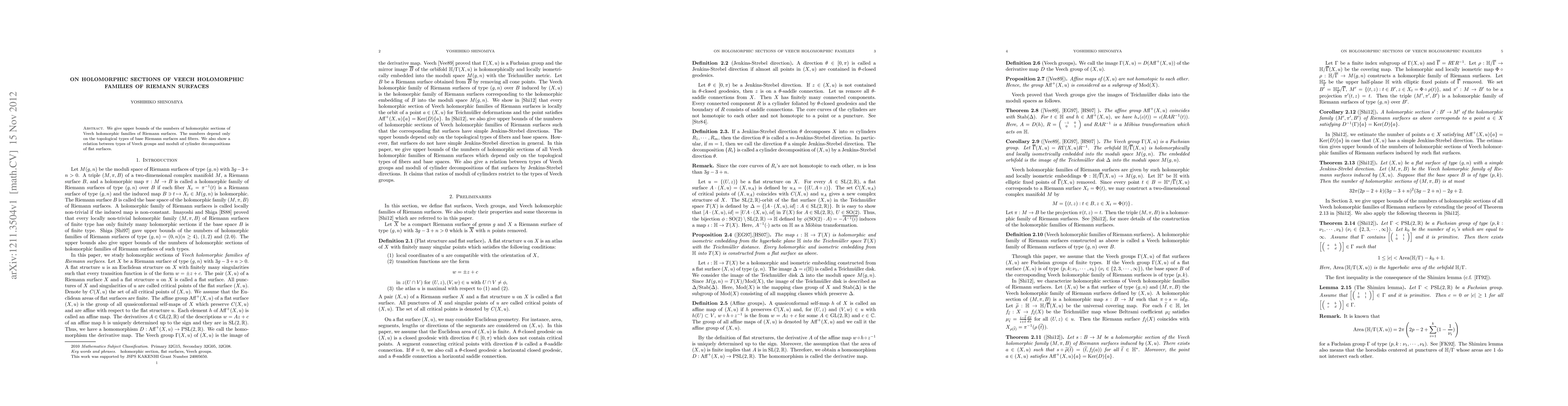 This paper provides upper bounds for the count of holomorphic sections in Veech families of Riemann surfaces, demonstrating that these counts depend solely on the topological types of base surfaces and fibers. It also establishes a connection between Veech groups and moduli of cylinder decompositions of flat surfaces.