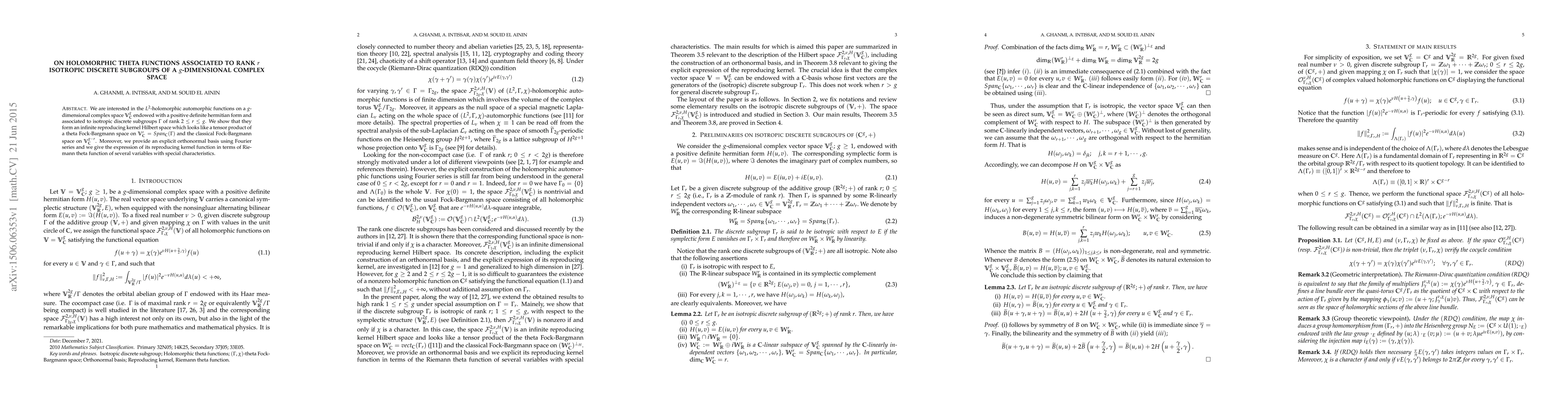 The paper investigates $L^2$-holomorphic automorphic functions on a $g$-dimensional complex space $V^g_{\mathbb{C}}$ endowed with a positive definite hermitian form, associated with isotropic discrete subgroups $\Gamma$ of rank $2 \leq r \leq g$. It demonstrates that these functions form an infinite reproducing kernel Hilbert space resembling a tensor product of a theta Fock-Bargmann space on $V^{r}_{\mathbb{C}}$ and the classical Fock-Bargmann space on $V^{g-r}_{\mathbb{C}}$.