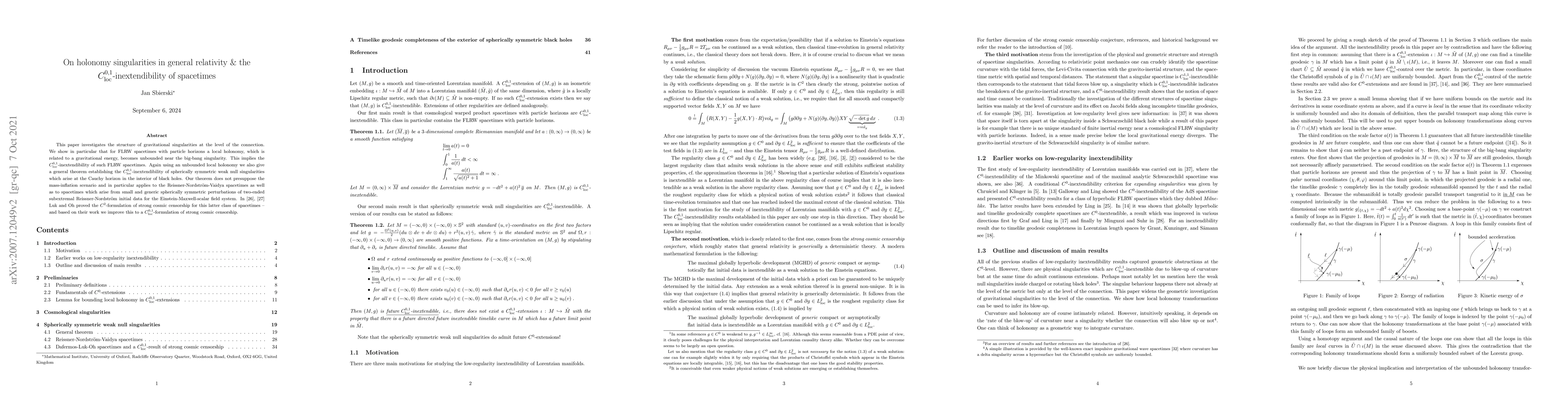 This paper explores gravitational singularities in the context of general relativity, demonstrating that local holonomy becomes unbounded near the big-bang singularity, leading to the $C^{0,1}_{\mathrm{loc}}$-inextendibility of FLRW spacetimes. It also establishes a general theorem for the $C^{0,1}_{\mathrm{loc}}$-inextendibility of spherically symmetric weak null singularities, improving the formulation of strong cosmic censorship.
