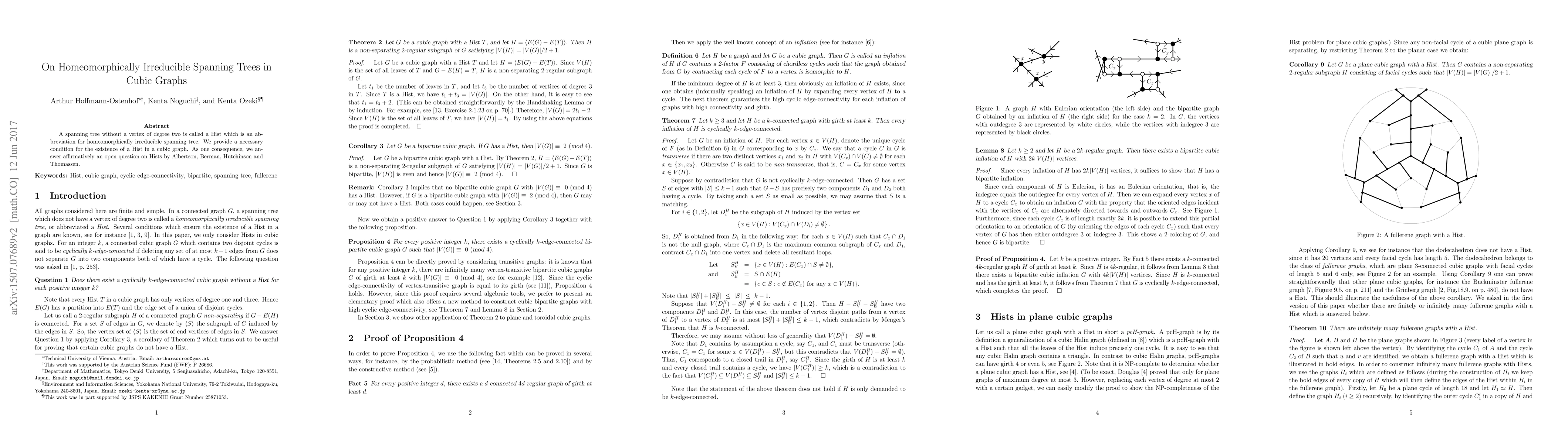 A spanning tree without a vertex of degree two is called a Hist which is an abbreviation for homeomorphically irreducible spanning tree. We provide a necessary condition for the existence of a Hist in a cubic graph. As one consequence, we answer affirmatively an open question on Hists by Albertson, Berman, Hutchinson and Thomassen.