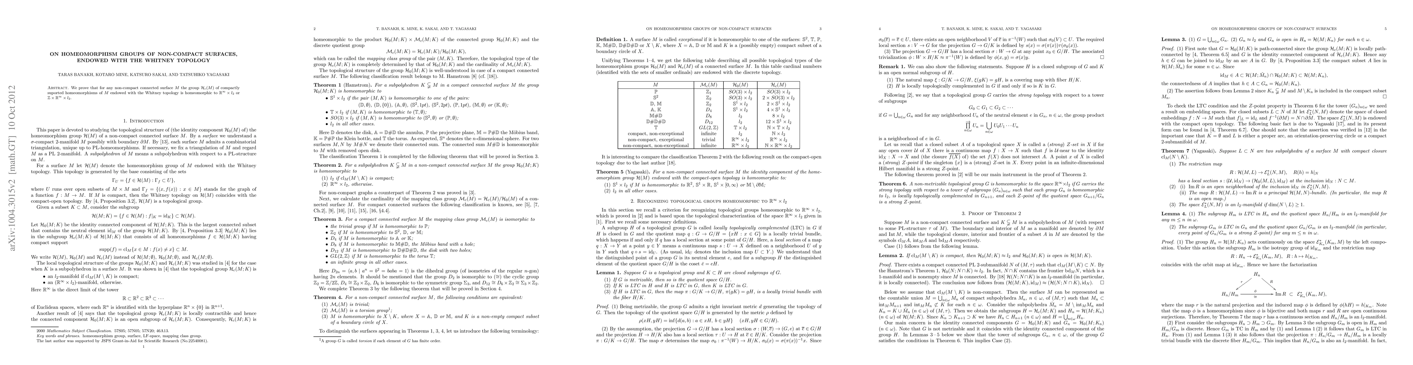 We prove that for any non-compact connected surface $M$ the group $H_c(M)$ of compactly suported homeomorphisms of $M$ endowed with the Whitney topology is homeomorphic to $R^\infty\times l_2$ or $Z\times R^\infty\times l_2$.