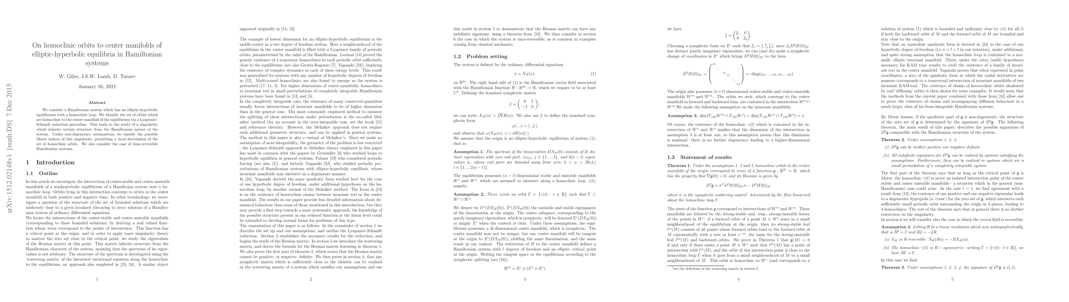 This paper investigates homoclinic orbits in Hamiltonian systems near elliptic-hyperbolic equilibria, employing a Lyapunov-Schmidt reduction to classify these orbits. It explores the singularity's structure and the Morse indices under non-degeneracy, with a focus on both general and time-reversible systems.