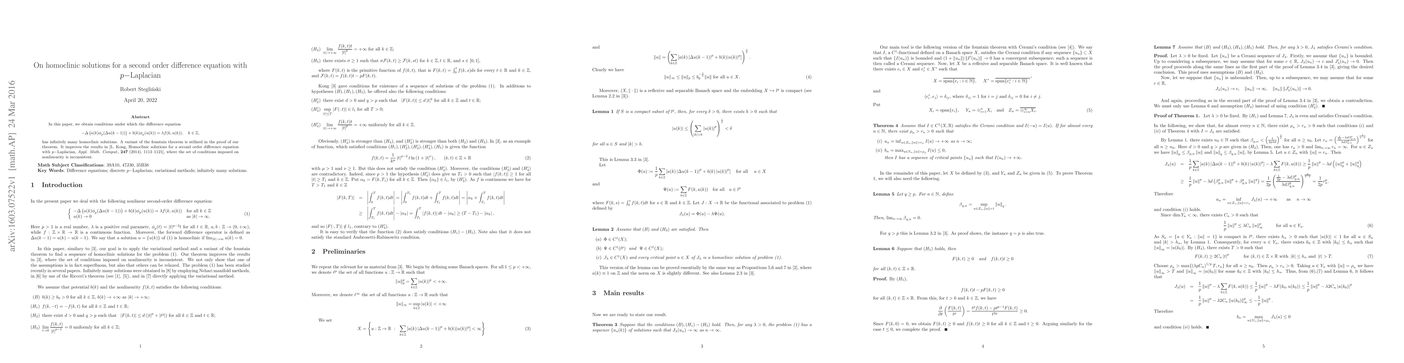 This paper establishes conditions for the second-order difference equation with a p-Laplacian to have infinitely many homoclinic solutions, utilizing a variant of the fountain theorem. It improves upon previous results by correcting inconsistent conditions on the nonlinearity.