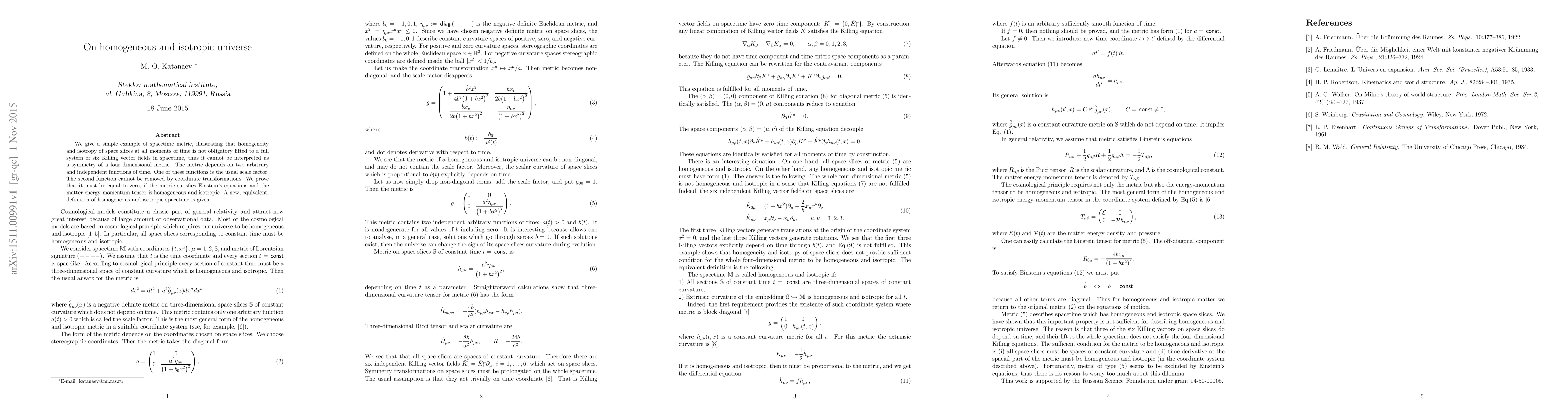 This paper demonstrates that homogeneity and isotropy in space slices do not necessarily imply a full set of six Killing vector fields in spacetime, challenging the conventional symmetry interpretation. The authors introduce a new metric dependent on two time functions, proving that under Einstein's equations and homogeneous, isotropic matter, only the usual scale factor remains, while the second function must be zero.