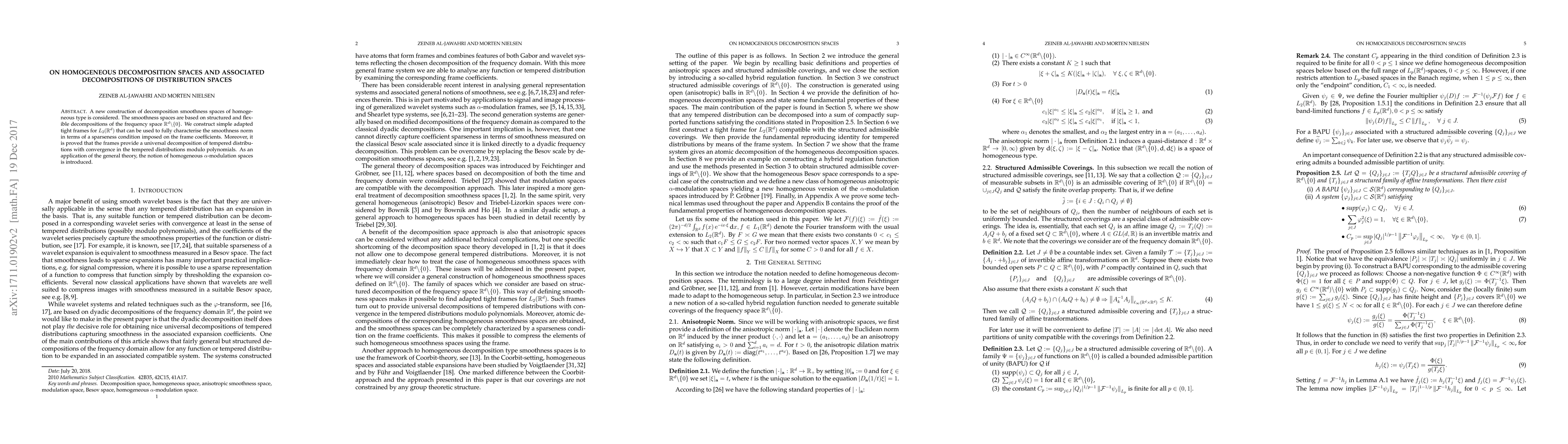 A new construction of decomposition smoothness spaces of homogeneous type is considered. The smoothness spaces are based on structured and flexible decompositions of the frequency space $\mathbb{R}^d\backslash\{0\}$. We construct simple adapted tight frames for $L_2(\mathbb{R}^d)$ that can be used to fully characterise the smoothness norm in terms of a sparseness condition imposed on the frame coefficients. Moreover, it is proved that the frames provide a universal decomposition of tempered distributions with convergence in the tempered distributions modulo polynomials. As an application of the general theory, the notion of homogeneous $\alpha$-modulation spaces is introduced.