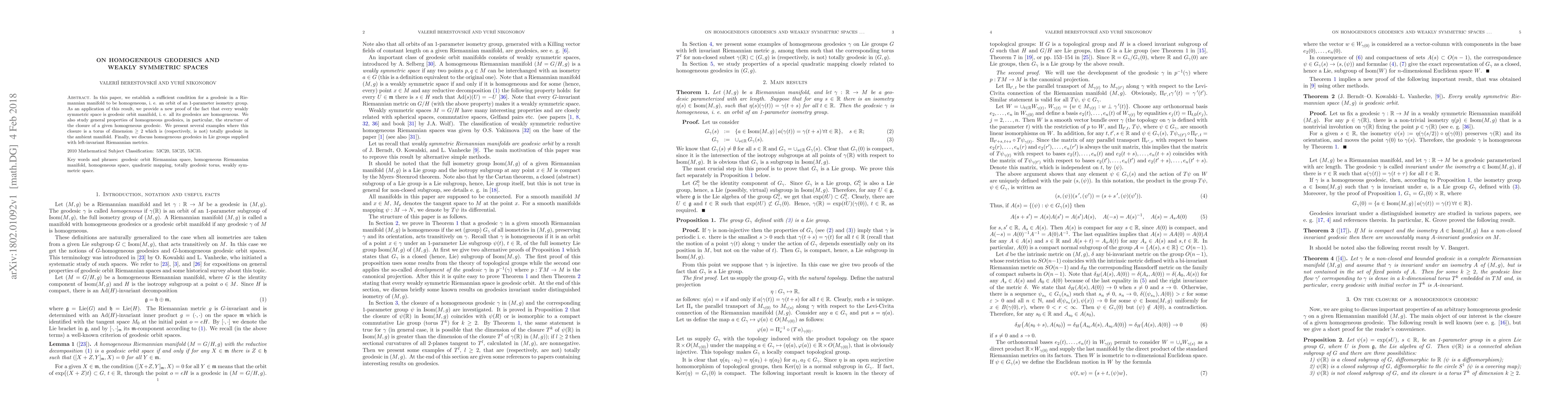 In this paper, we establish a sufficient condition for a geodesic in a Riemannian manifold to be homogeneous, i.e. an orbit of an $1$-parameter isometry group. As an application of this result, we provide a new proof of the fact that every weakly symmetric space is geodesic orbit manifold, i.e. all its geodesics are homogeneous. We also study general properties of homogeneous geodesics, in particular, the structure of the closure of a given homogeneous geodesic. We present several examples where this closure is a torus of dimension $\geq 2$ which is (respectively, is not) totally geodesic in the ambient manifold. Finally, we discuss homogeneous geodesics in Lie groups supplied with left-invariant Riemannian metrics.