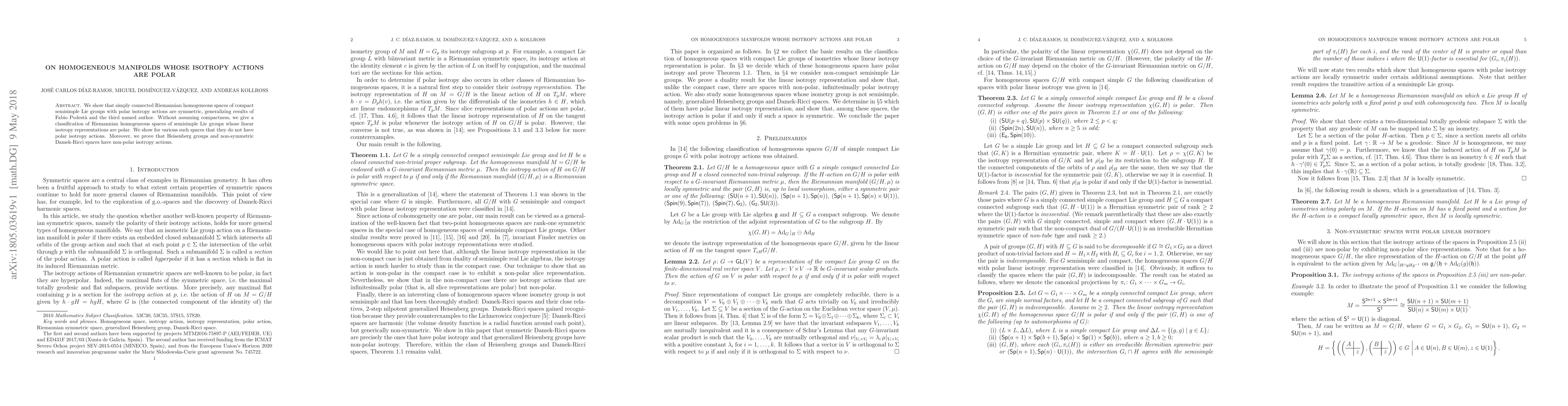 This paper classifies Riemannian homogeneous spaces of semisimple Lie groups with polar isotropy actions, showing they are symmetric and proving that Heisenberg groups and non-symmetric Damek-Ricci spaces do not exhibit such actions.