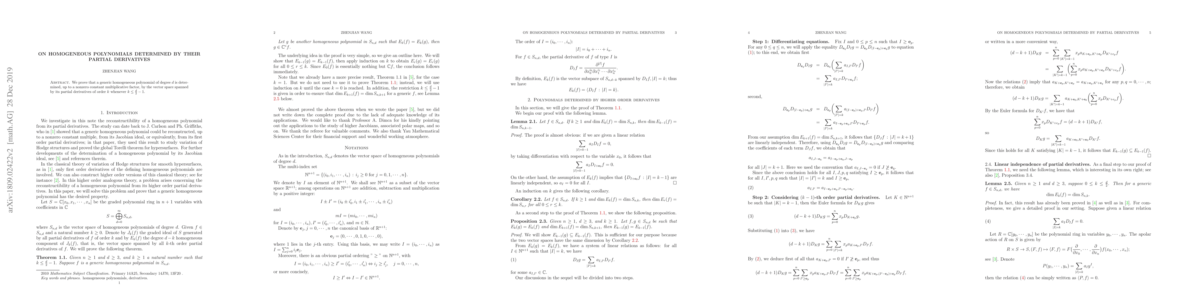 We prove that a generic homogeneous polynomial of degree $d$ is determined, up to a nonzero constant multiplicative factor, by the vector space spanned by its partial derivatives of order $k$ whenever $k\leq\frac{d}{2}-1$.