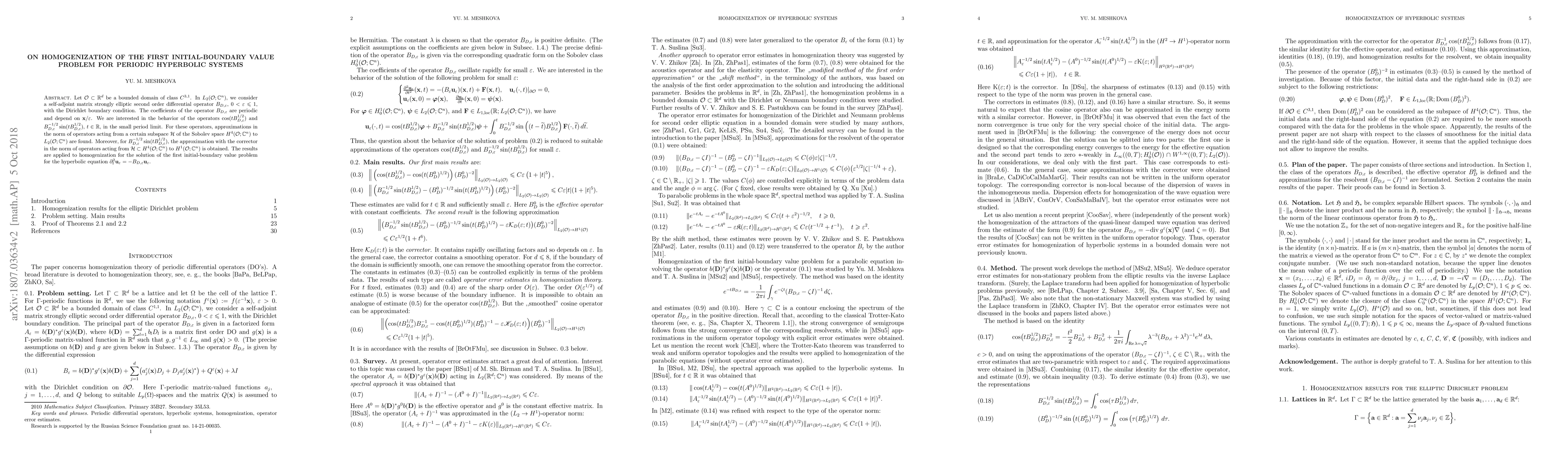 This paper studies the homogenization of hyperbolic systems with periodic coefficients, focusing on the behavior of specific operators in the small period limit. It provides operator approximations and correctors for the solution of the first initial-boundary value problem in hyperbolic equations.