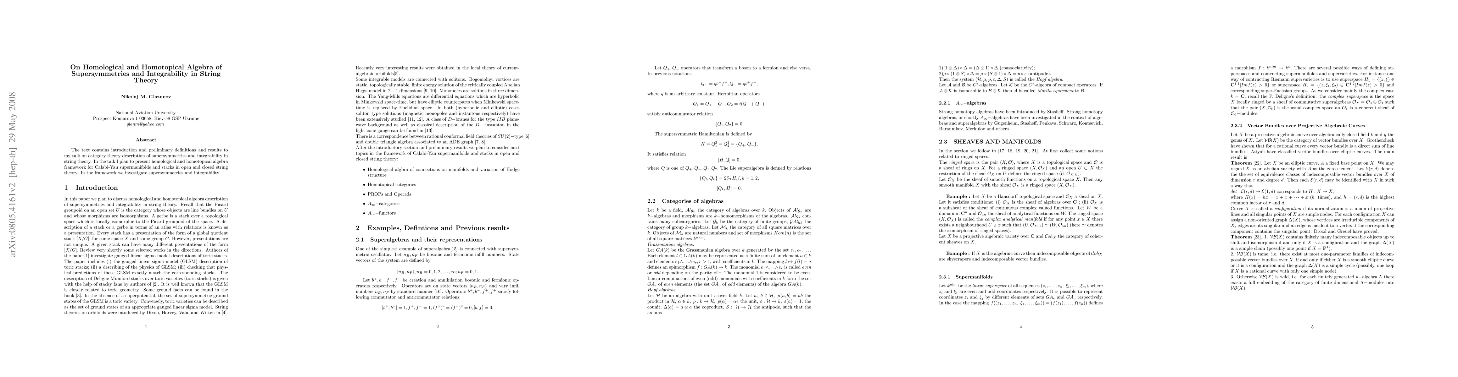 The text contains introduction and preliminary definitions and results to my talk on category theory description of supersymmetries and integrability in string theory. In the talk I plan to present homological and homotopical algebra framework for Calabi-Yau supermanifolds and stacks in open and closed string theory. In the framework we investigate supersymmetries and integrability.