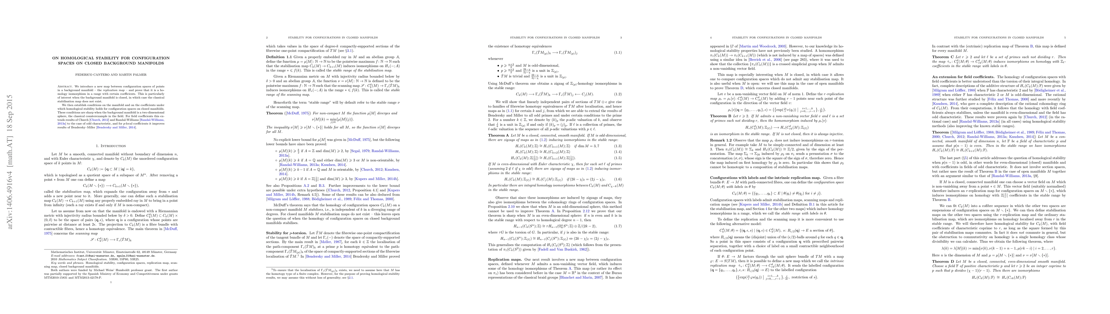 This paper introduces a replication map between configuration spaces on closed background manifolds, proving it is a homology isomorphism under certain conditions. It establishes homological stability for these spaces, particularly when the background is a closed manifold, improving previous results for field and $p$-local coefficients.
