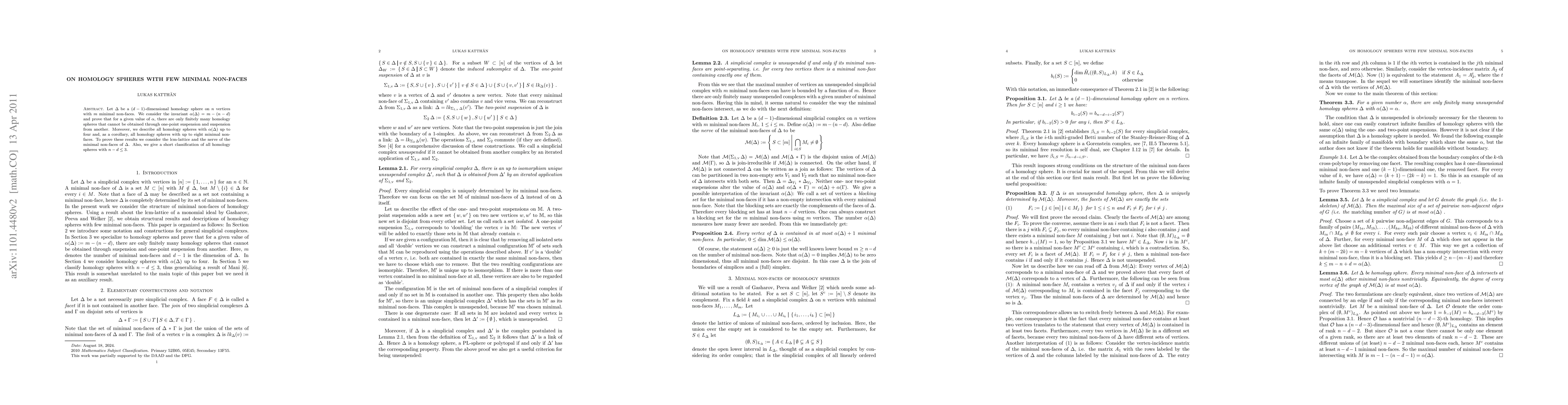 This paper investigates (d-1)-dimensional homology spheres with a focus on those having few minimal non-faces, proving that for a given value of the invariant \alpha = m - (n-d), only finitely many homology spheres exist beyond certain constructions. It also details all homology spheres with \alpha up to four, and hence up to eight minimal non-faces, using the nerve of minimal non-faces.