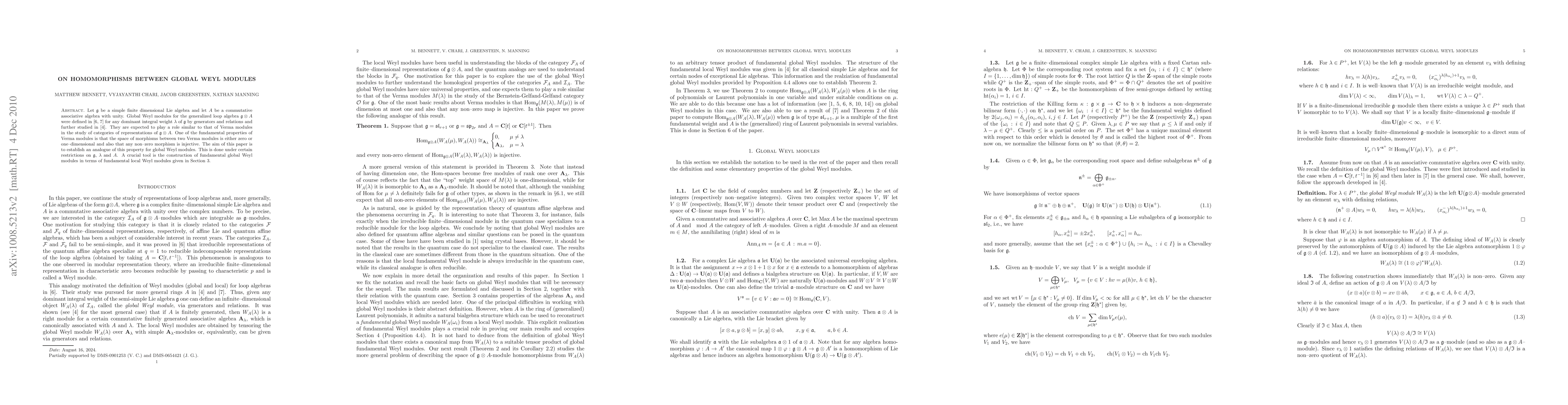 Global Weyl modules for generalized loop algebras $\lie g\tensor A$, where $\lie g$ is a simple finite dimensional Lie algebra and A is a commutative associative algebra were defined, for any dominant integral weight $\lambda$, by generators and relations. They are expected to play the role similar to that of Verma modules in the study of categories of representations of these algebras. One of the fundamental properties of Verma modules is that the space of morphisms between two Verma modules is either zero or one--dimensional and also that any non--zero morphism is injective. The aim of this paper is to establish an analogue of this property for the global Weyl modules. This is done under certain restrictions on the Lie algebra $\lie g$, $\lambda$ and $A$. A crucial tool is the construction of fundamental global Weyl modules in terms of fundamental local Weyl modules given in Section 3.