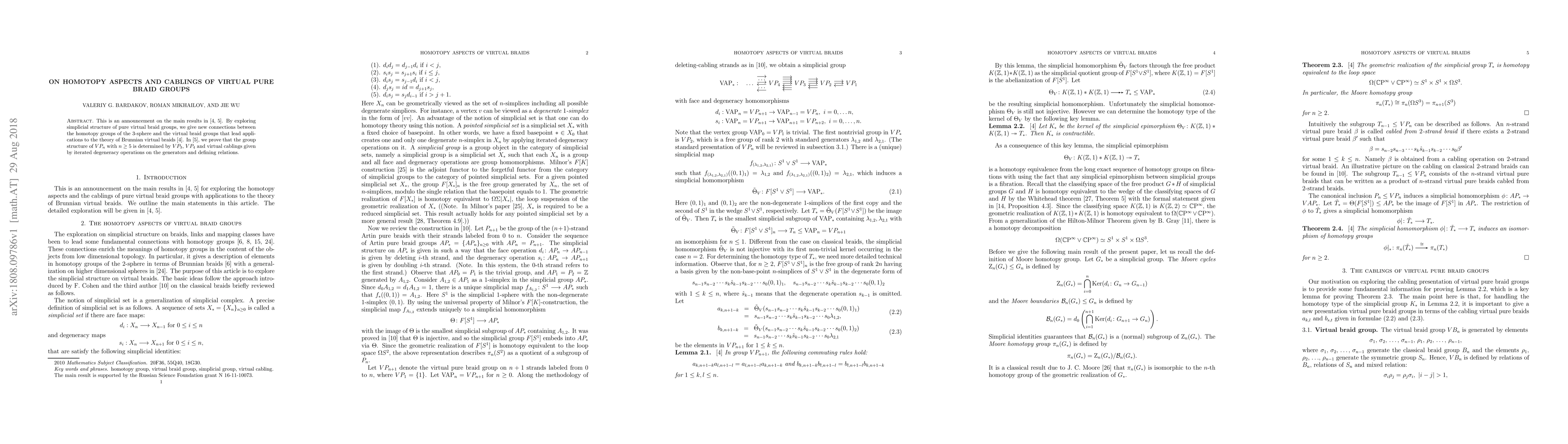 By exploring simplicial structure of pure virtual braid groups, we give new connections between the homotopy groups of the 3-sphere and the virtual braid groups that are related to the theory of Brunnian virtual braids. The group structure of VP_n with n > 4 is determined by VP_3, VP_4 and virtual cablings given by iterated degeneracy operations on the generators and defining relations. The complete proofs will be published in the two forthcoming papers.