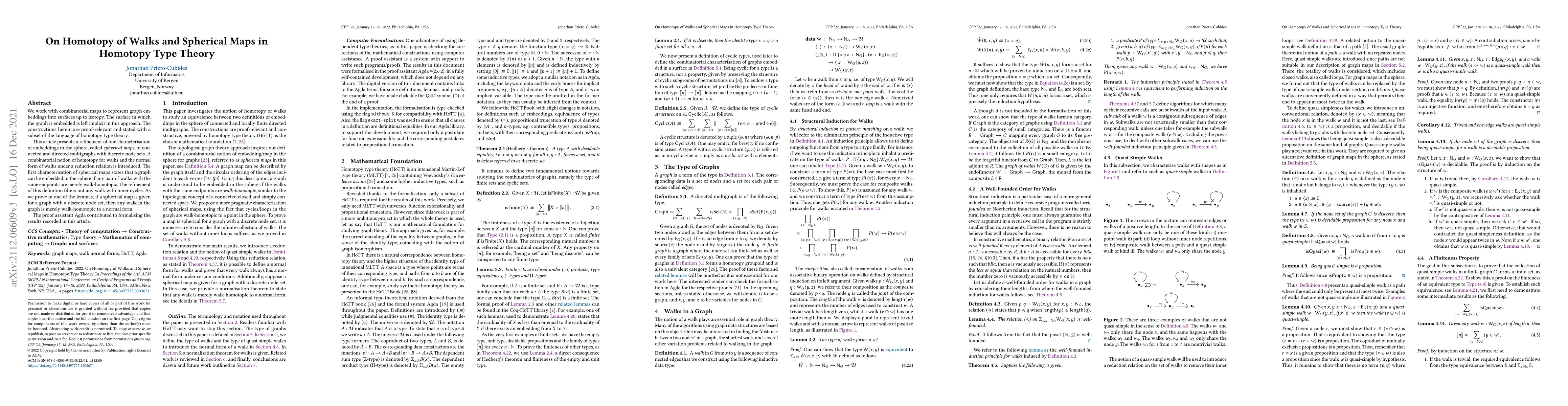 We work with combinatorial maps to represent graph embeddings into surfaces up to isotopy. The surface in which the graph is embedded is left implicit in this approach. The constructions herein are proof-relevant and stated with a subset of the language of homotopy type theory. This article presents a refinement of one characterisation of embeddings in the sphere, called spherical maps, of connected and directed multigraphs with discrete node sets. A combinatorial notion of homotopy for walks and the normal form of walks under a reduction relation is introduced. The first characterisation of spherical maps states that a graph can be embedded in the sphere if any pair of walks with the same endpoints are merely walk-homotopic. The refinement of this definition filters out any walk with inner cycles. As we prove in one of the lemmas, if a spherical map is given for a graph with a discrete node set, then any walk in the graph is merely walk-homotopic to a normal form. The proof assistant Agda contributed to formalising the results recorded in this article.