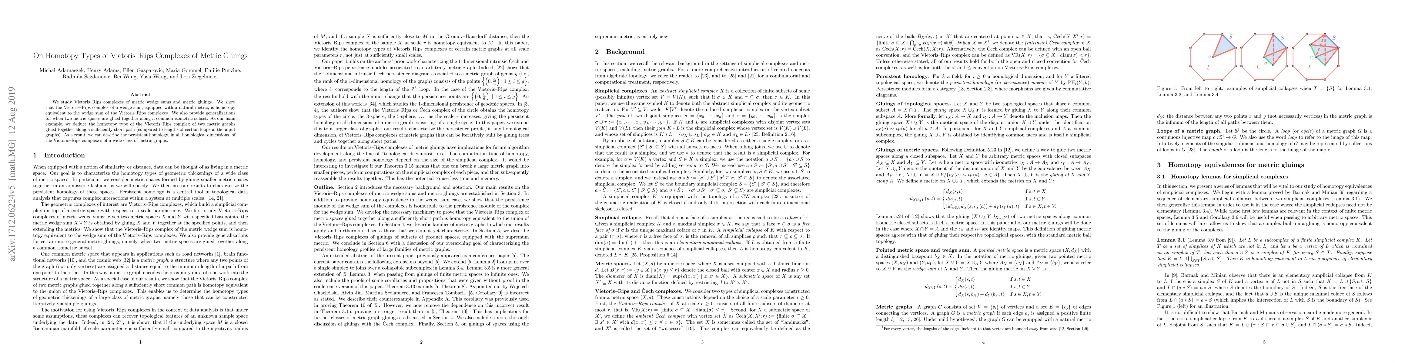 This paper investigates the homotopy types of Vietoris-Rips complexes for metric gluings and wedge sums, demonstrating that the complex of a wedge sum is homotopy equivalent to the wedge sum of its individual complexes. It generalizes this to metric spaces glued along common isometric subsets, particularly analyzing the case of two metric graphs glued along a short path.
