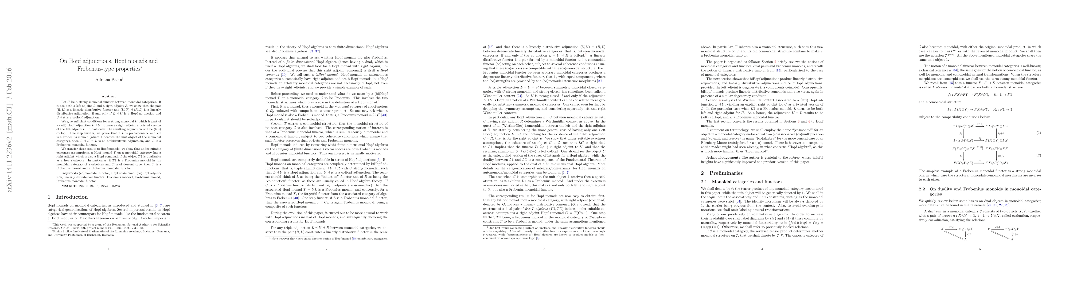 This paper explores Hopf adjunctions and related Frobenius-type properties within monoidal categories. It establishes conditions for strong monoidal functors to form Hopf adjunctions and proves that under specific exactness assumptions, Hopf monads with certain dualizability properties can have Hopf comonad right adjoints, leading to Frobenius monad and monoidal functor characteristics.