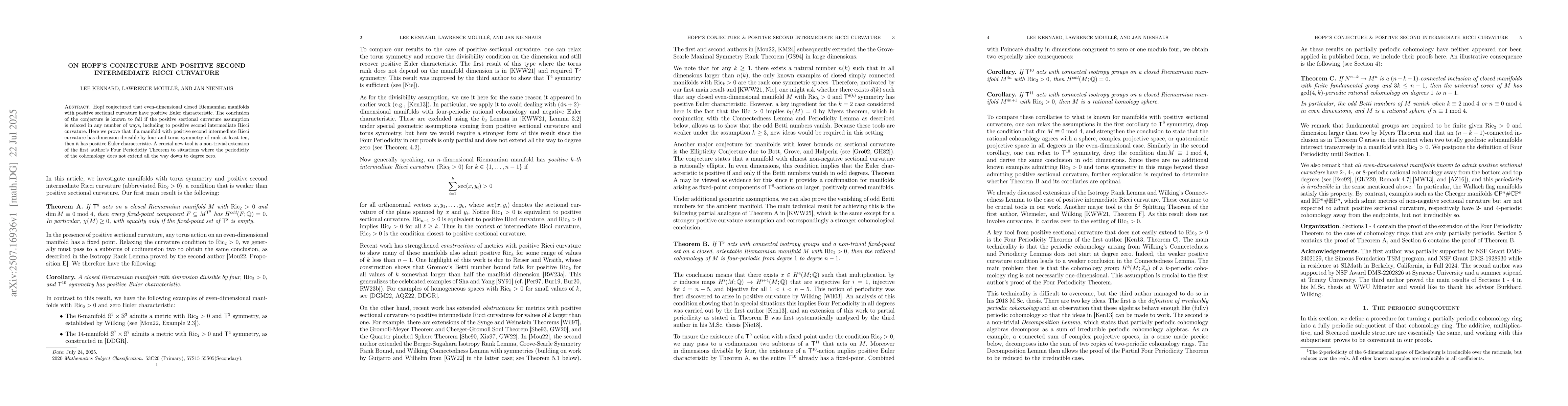 Hopf conjectured that even-dimensional closed Riemannian manifolds with positive sectional curvature have positive Euler characteristic. The conclusion of the conjecture is known to fail if the positive sectional curvature assumption is relaxed in any number of ways, including to positive second intermediate Ricci curvature. Here we prove that if a manifold with positive second intermediate Ricci curvature has dimension divisible by four and torus symmetry of rank at least ten, then it has positive Euler characteristic. A crucial new tool is a non-trivial extension of the first author's Four Periodicity Theorem to situations where the periodicity of the cohomology does not extend all the way down to degree zero.