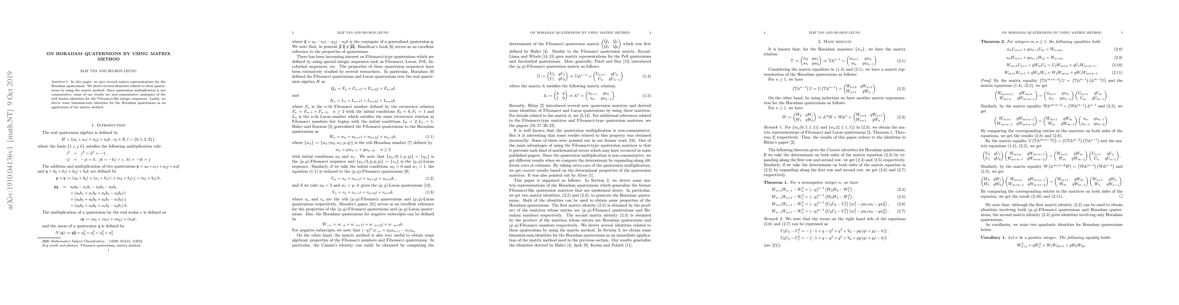 This paper presents matrix representations for Horadam quaternions and derives associated identities using the matrix method, highlighting non-commutative properties. It also applies the matrix method to derive binomial-sum identities for these quaternions.