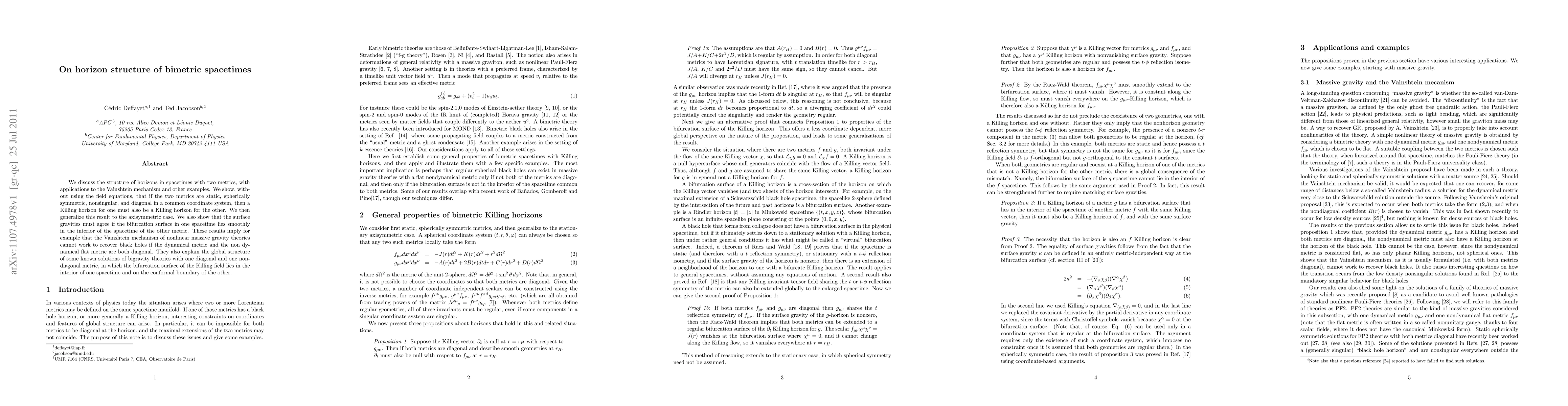 We discuss the structure of horizons in spacetimes with two metrics, with applications to the Vainshtein mechanism and other examples. We show, without using the field equations, that if the two metrics are static, spherically symmetric, nonsingular, and diagonal in a common coordinate system, then a Killing horizon for one must also be a Killing horizon for the other. We then generalize this result to the axisymmetric case. We also show that the surface gravities must agree if the bifurcation surface in one spacetime lies smoothly in the interior of the spacetime of the other metric. These results imply for example that the Vainshtein mechanism of nonlinear massive gravity theories cannot work to recover black holes if the dynamical metric and the non dynamical flat metric are both diagonal. They also explain the global structure of some known solutions of bigravity theories with one diagonal and one nondiagonal metric, in which the bifurcation surface of the Killing field lies in the interior of one spacetime and on the conformal boundary of the other.