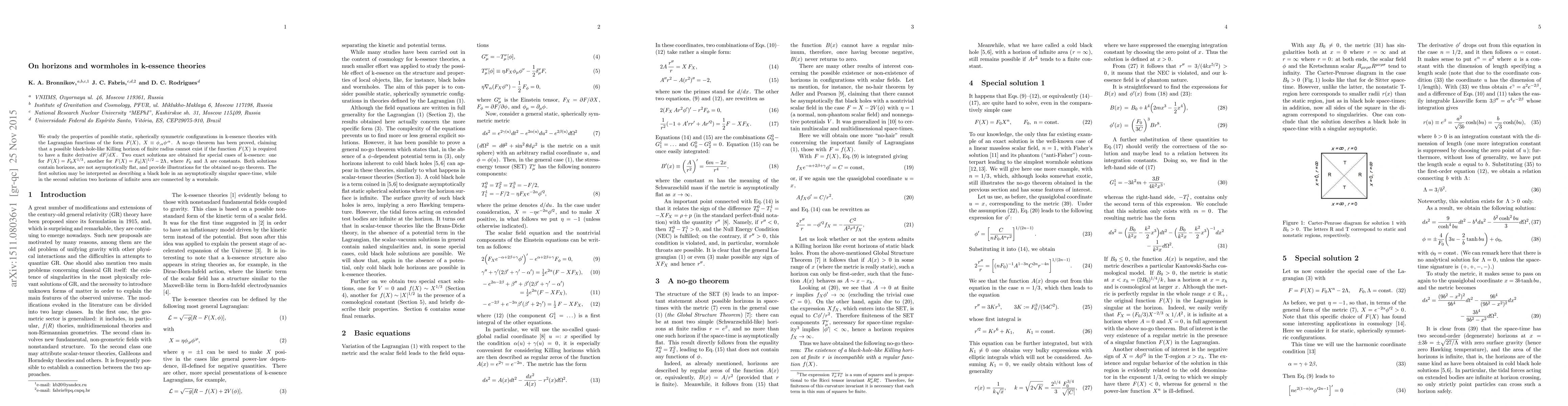 This research is significant as it explores the properties of k-essence theories in the context of black holes and wormholes, providing insights into the limitations of finite-radius black-hole-like horizons in k-essence theories with finite derivatives of F(X).