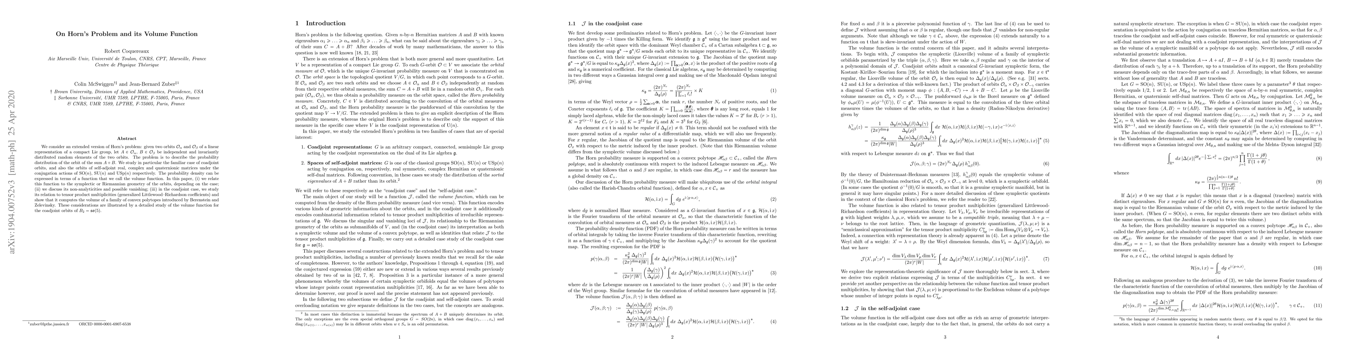 This paper extends Horn's problem to describe the probability distribution of the orbit of the sum of two independent random elements from given orbits of a compact Lie group. It introduces a volume function that relates to symplectic or Riemannian geometry and explores its non-analyticities and vanishing properties, particularly in the context of coadjoint orbits and self-adjoint matrices under various Lie groups.