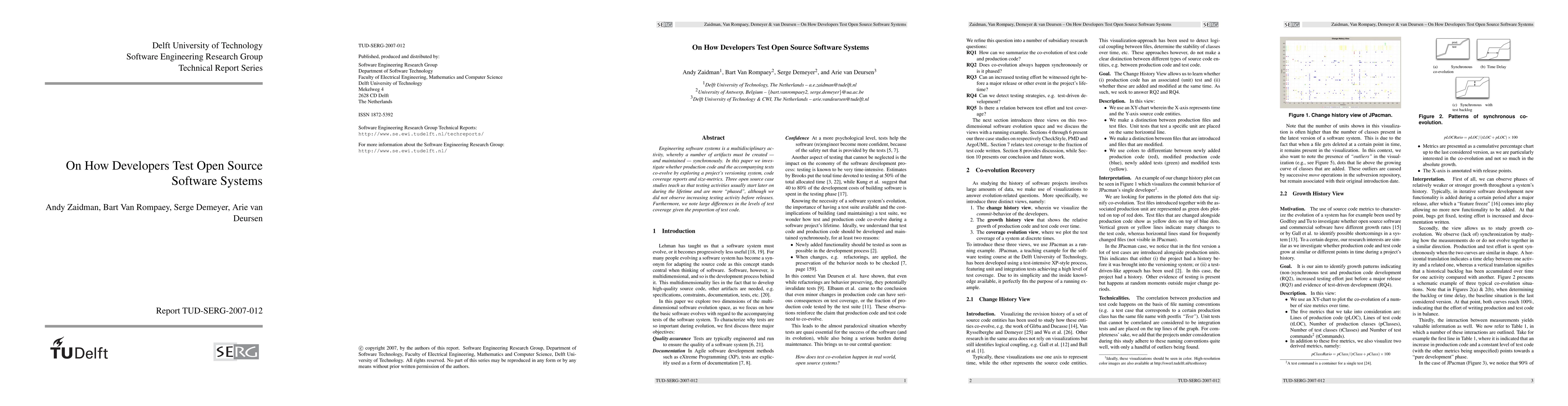 Engineering software systems is a multidisciplinary activity, whereby a number of artifacts must be created - and maintained - synchronously. In this paper we investigate whether production code and the accompanying tests co-evolve by exploring a project's versioning system, code coverage reports and size-metrics. Three open source case studies teach us that testing activities usually start later on during the lifetime and are more "phased", although we did not observe increasing testing activity before releases. Furthermore, we note large differences in the levels of test coverage given the proportion of test code.