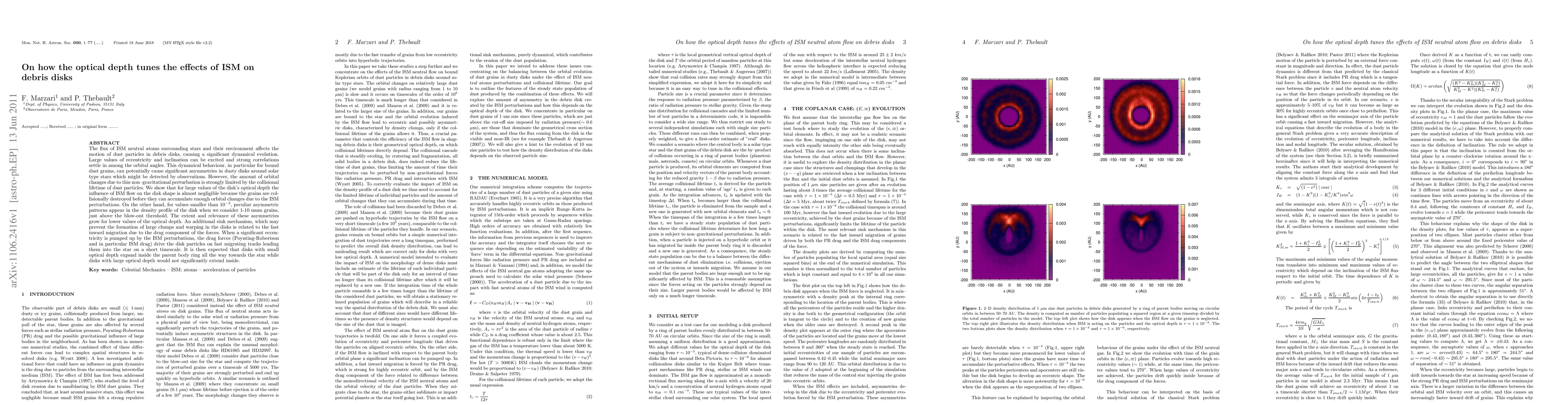 The flux of ISM neutral atoms surrounding stars and their environment affects the motion of dust particles in debris disks, causing a significant dynamical evolution. Large values of eccentricity and inclination can be excited and strong correlations settle in among the orbital angles. This dynamical behaviour, in particular for bound dust grains, can potentially cause significant asymmetries in dusty disks around solar type stars which might be detected by observations. However, the amount of orbital changes due to this non--gravitational perturbation is strongly limited by the collisional lifetime of dust particles. We show that for large values of the disk's optical depth the influence of ISM flow on the disk shape is almost negligible because the grains are collisionally destroyed before they can accumulate enough orbital changes due to the ISM perturbations. On the other hand, for values smaller than $10^{-3}$, peculiar asymmetric patterns appear in the density profile of the disk when we consider 1-10 mum grains, just above the blow-out threshold. The extent and relevance of these asymmetries grow for lower values of the optical depth. An additional sink mechanism, which may prevent the formation of large clumps and warping in the disks is related to the fast inward migration due to the drag component of the forces. When a significant eccentricity is pumped up by the ISM perturbations, the drag forces (Poynting-Robertson and in particular ISM drag) drive the disk particles on fast migrating tracks leading them into the star on a short timescale. It is then expected that disks with small optical depth expand inside the parent body ring all the way towards the star while disks with large optical depth would not significantly extend inside.