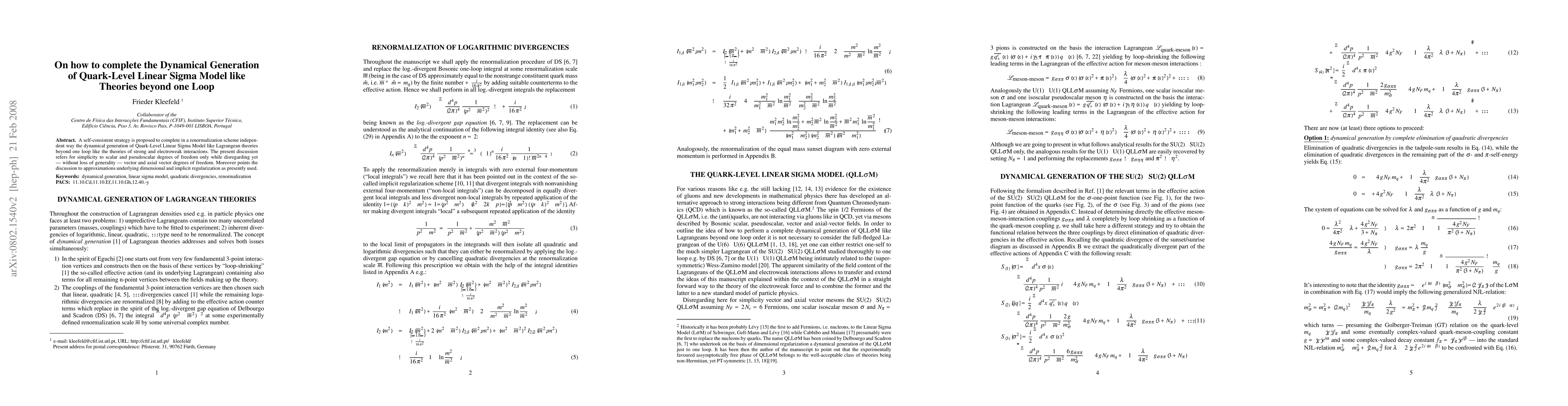 A self-consistent strategy is proposed to complete in a renormalization scheme independent way the dynamical generation of Quark-Level Linear Sigma Model like Lagrangean theories beyond one loop like the theories of strong and electroweak interactions. The present discussion refers for simplicity to scalar and pseudoscalar degrees of freedom only while disregarding yet - without loss of generality - vector and axial vector degrees of freedom. Moreover points the discussion to approximations underlying dimensional and implicit regularization as presently used.