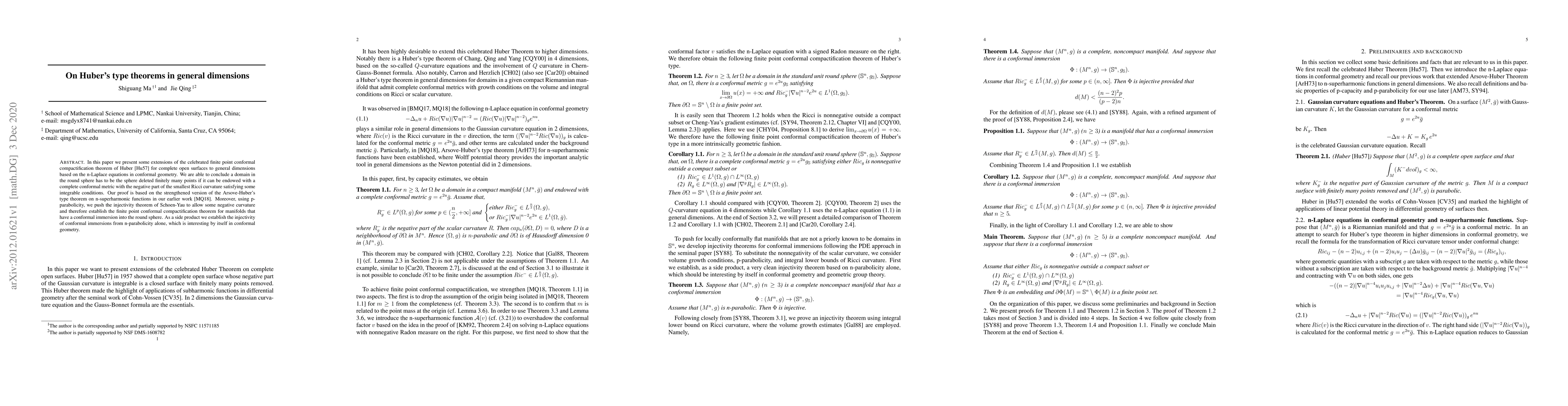 This paper extends Huber's finite point conformal compactification theorem to higher dimensions using n-Laplace equations and p-parabolicity, proving that a domain in the round sphere with certain negative Ricci curvature conditions must be the sphere minus finitely many points. The proof leverages Arsove-Huber's theorem on n-superharmonic functions and establishes the injectivity of conformal immersions under n-parabolicity.