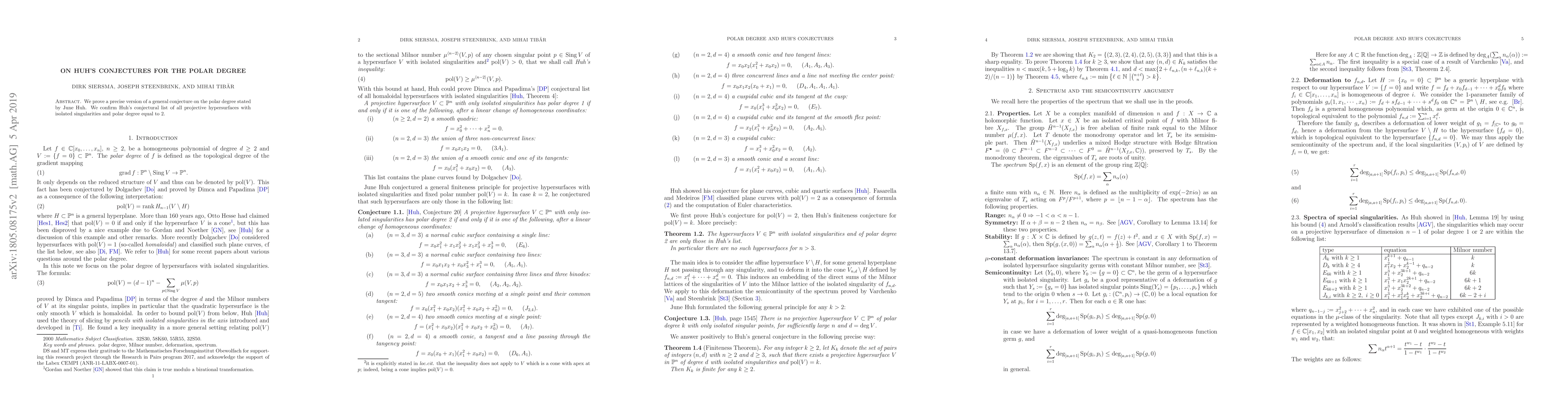 This paper confirms June Huh's conjecture by proving a precise version regarding the polar degree of projective hypersurfaces with isolated singularities, specifically verifying the conjectured list of such hypersurfaces with a polar degree of 2.