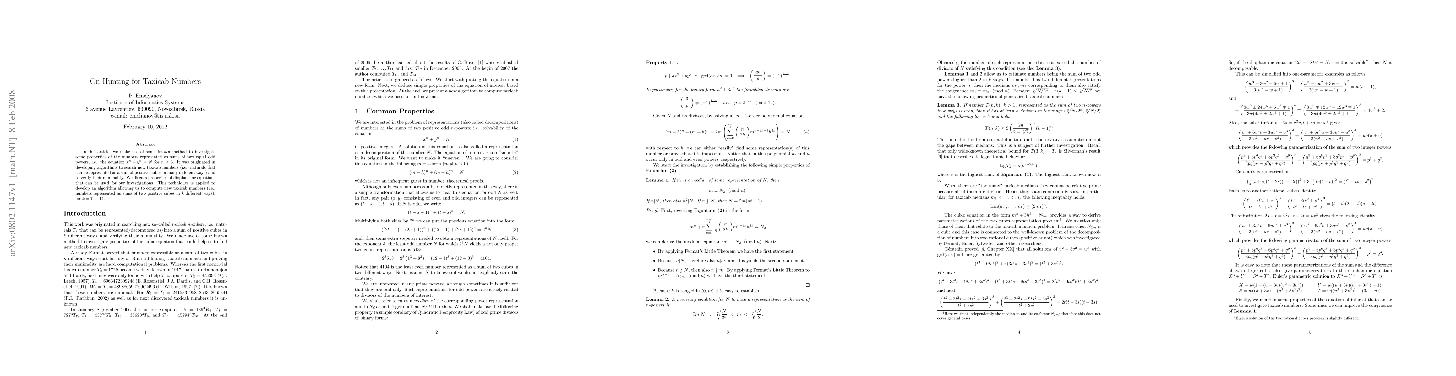 In this article, we make use of some known method to investigate some properties of the numbers represented as sums of two equal odd powers, i.e., the equation $x^n+y^n=N$ for $n\ge3$. It was originated in developing algorithms to search new taxicab numbers (i.e., naturals that can be represented as a sum of positive cubes in many different ways) and to verify their minimality. We discuss properties of diophantine equations that can be used for our investigations. This techniques is applied to develop an algorithm allowing us to compute new taxicab numbers (i.e., numbers represented as sums of two positive cubes in $k$ different ways), for $k=7...14$.