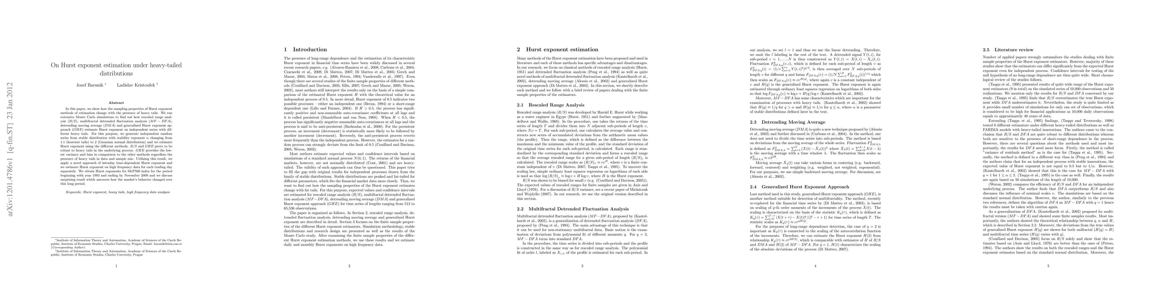 In this paper, we show how the sampling properties of the Hurst exponent methods of estimation change with the presence of heavy tails. We run extensive Monte Carlo simulations to find out how rescaled range analysis (R/S), multifractal detrended fluctuation analysis (MF-DFA), detrending moving average (DMA) and generalized Hurst exponent approach (GHE) estimate Hurst exponent on independent series with different heavy tails. For this purpose, we generate independent random series from stable distribution with stability exponent {\alpha} changing from 1.1 (heaviest tails) to 2 (Gaussian normal distribution) and we estimate the Hurst exponent using the different methods. R/S and GHE prove to be robust to heavy tails in the underlying process. GHE provides the lowest variance and bias in comparison to the other methods regardless the presence of heavy tails in data and sample size. Utilizing this result, we apply a novel approach of the intraday time-dependent Hurst exponent and we estimate the Hurst exponent on high frequency data for each trading day separately. We obtain Hurst exponents for S&P500 index for the period beginning with year 1983 and ending by November 2009 and we discuss the surprising result which uncovers how the market's behavior changed over this long period.