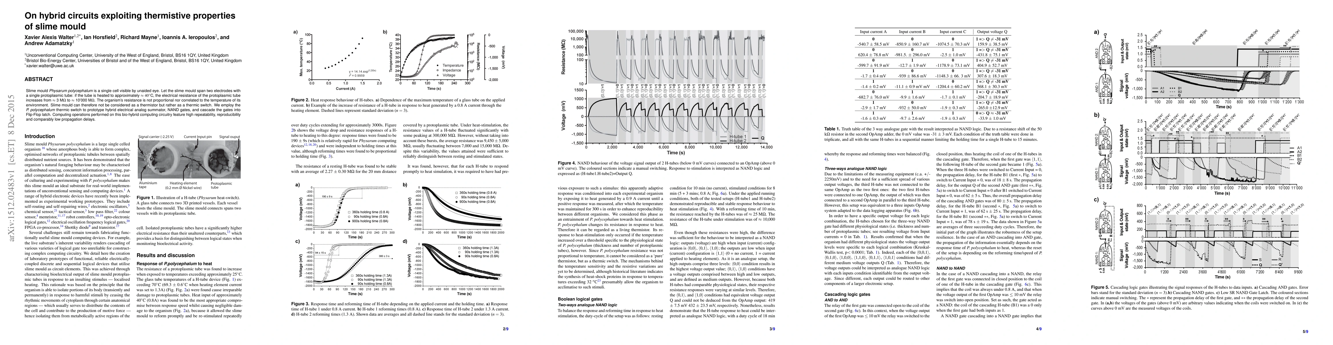 This paper explores the use of slime mould Physarum polycephalum as a thermic switch in hybrid circuits, demonstrating its application in creating analog summators, NAND gates, and Flip-Flop latches with high repeatability and low propagation delays. The organism's unique thermistive properties enable it to function beyond traditional resistive materials.
