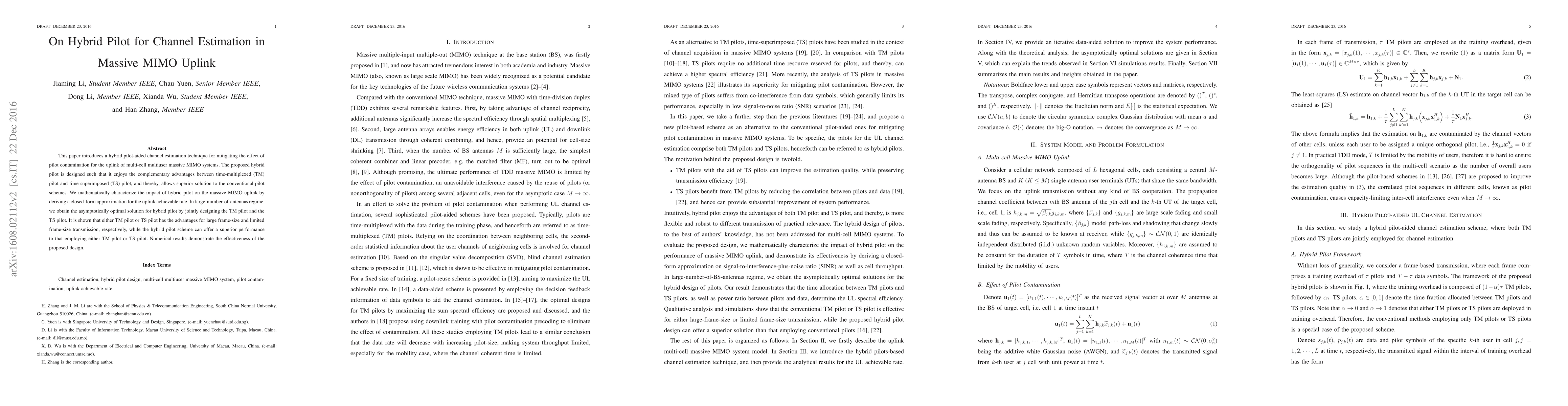 This paper introduces a hybrid pilot-aided channel estimation technique for mitigating the effect of pilot contamination for the uplink of multi-cell multiuser massive MIMO systems. The proposed hybrid pilot is designed such that it enjoys the complementary advantages between time-multiplexed (TM) pilot and time-superimposed (TS) pilot, and thereby, allows superior solution to the conventional pilot schemes. We mathematically characterize the impact of hybrid pilot on the massive MIMO uplink by deriving a closed-form approximation for the uplink achievable rate. In large-number-of-antennas regime, we obtain the asymptotically optimal solution for hybrid pilot by jointly designing the TM pilot and the TS pilot. It is shown that either TM pilot or TS pilot has the advantages for large frame-size and limited frame-size transmission, respectively, while the hybrid pilot scheme can offer a superior performance to that employing either TM pilot or TS pilot. Numerical results demonstrate the effectiveness of the proposed design.