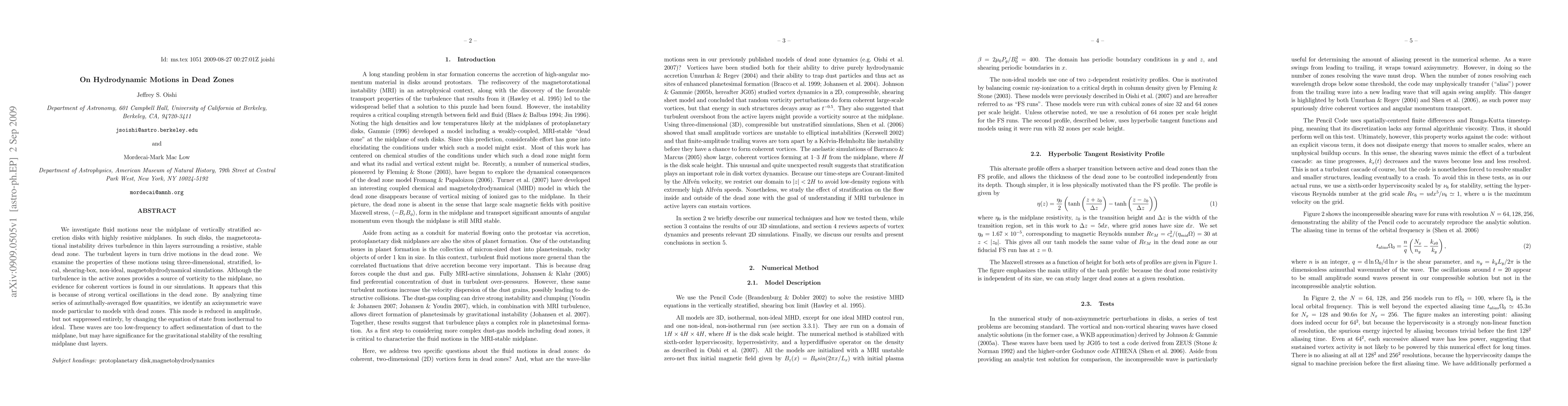 We investigate fluid motions near the midplane of vertically stratified accretion disks with highly resistive midplanes. In such disks, the magnetorotational instability drives turbulence in thin layers surrounding a resistive, stable dead zone. The turbulent layers in turn drive motions in the dead zone. We examine the properties of these motions using three-dimensional, stratified, local, shearing-box, non-ideal, magnetohydrodynamical simulations. Although the turbulence in the active zones provides a source of vorticity to the midplane, no evidence for coherent vortices is found in our simulations. It appears that this is because of strong vertical oscillations in the dead zone. By analyzing time series of azimuthally-averaged flow quantities, we identify an axisymmetric wave mode particular to models with dead zones. This mode is reduced in amplitude, but not suppressed entirely, by changing the equation of state from isothermal to ideal. These waves are too low-frequency to affect sedimentation of dust to the midplane, but may have significance for the gravitational stability of the resulting midplane dust layers.