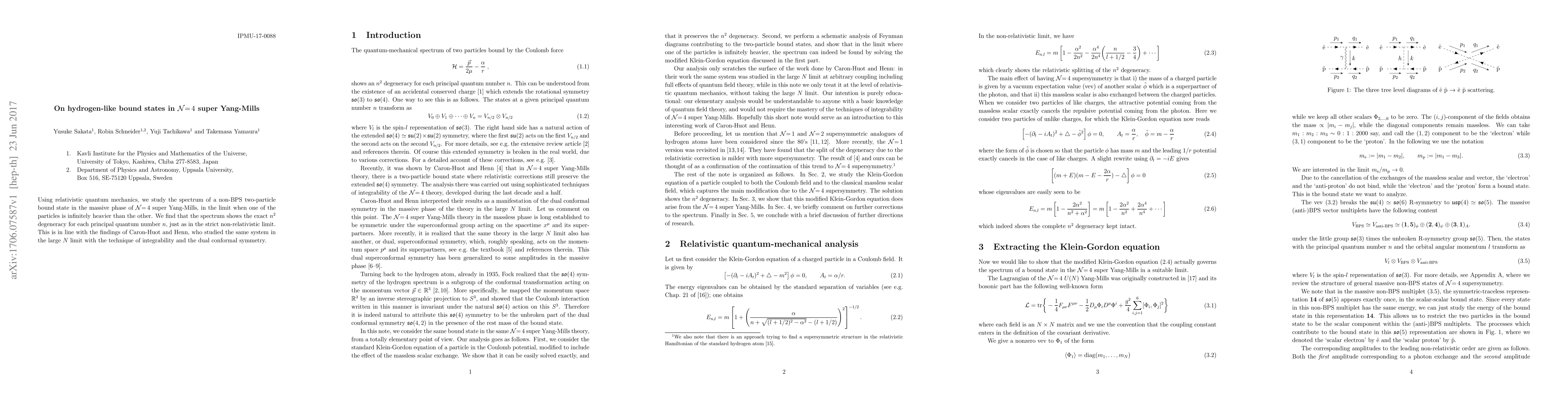 Summary: This study investigates the spectrum of a non-BPS two-particle bound state in $\mathcal{N}=4$ super Yang-Mills using relativistic quantum mechanics, revealing exact $n^2$ degeneracy for each principal quantum number $n$, akin to the non-relativistic limit, corroborating previous findings by Caron-Huot and Henn in the large $N$ limit through integrability techniques.