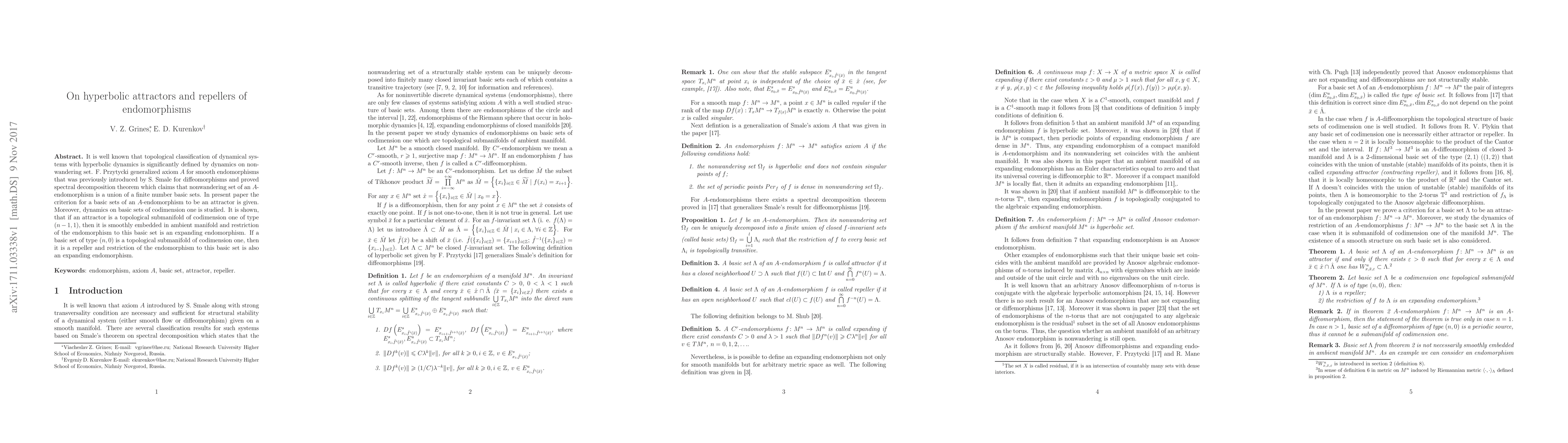 It is well known that topological classification of dynamical systems with hyperbolic dynamics is significantly defined by dynamics on nonwandering set. F. Przytycki generalized axiom $A$ for smooth endomorphisms that was previously introduced by S. Smale for diffeomorphisms and proved spectral decomposition theorem which claims that nonwandering set of an $A$-endomorphism is a union of a finite number basic sets. In present paper the criterion for a basic sets of an $A$-endomorphism to be an attractor is given. Moreover, dynamics on basic sets of codimension one is studied. It is shown, that if an attractor is a topological submanifold of codimension one of type $(n-1, 1)$, then it is smoothly embedded in ambient manifold and restriction of the endomorphism to this basic set is an expanding endomorphism. If a basic set of type $(n, 0)$ is a topological submanifold of codimension one, then it is a repeller and restriction of the endomorphism to this basic set is also an expanding endomorphism.