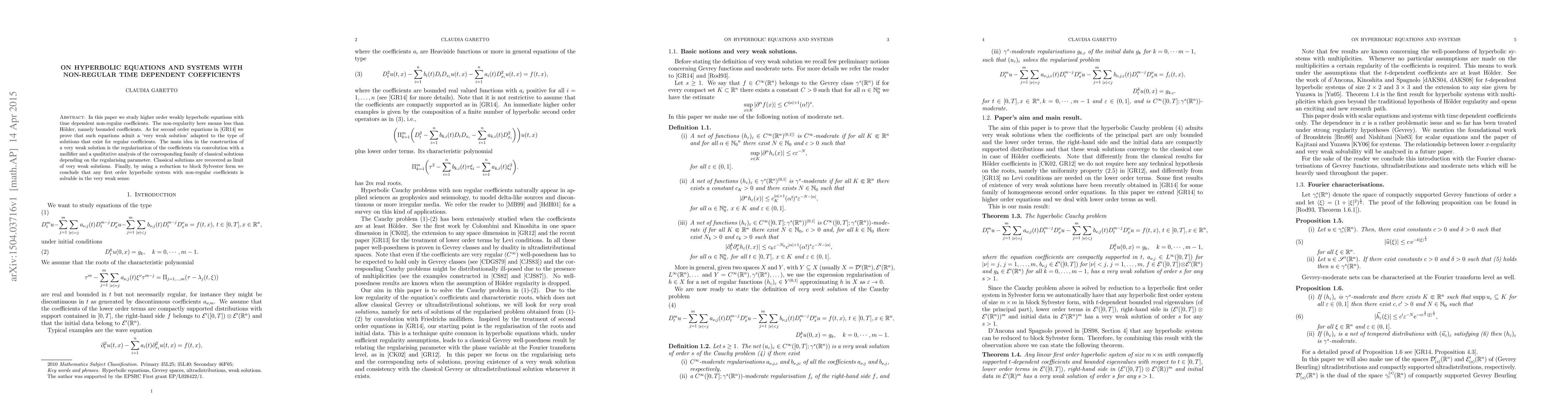 This paper investigates higher order weakly hyperbolic equations with time-dependent non-regular (bounded, less than H\"older) coefficients, proving the existence of a 'very weak solution' through coefficient regularization and qualitative analysis. It concludes that first-order hyperbolic systems with such coefficients are solvable in the very weak sense.