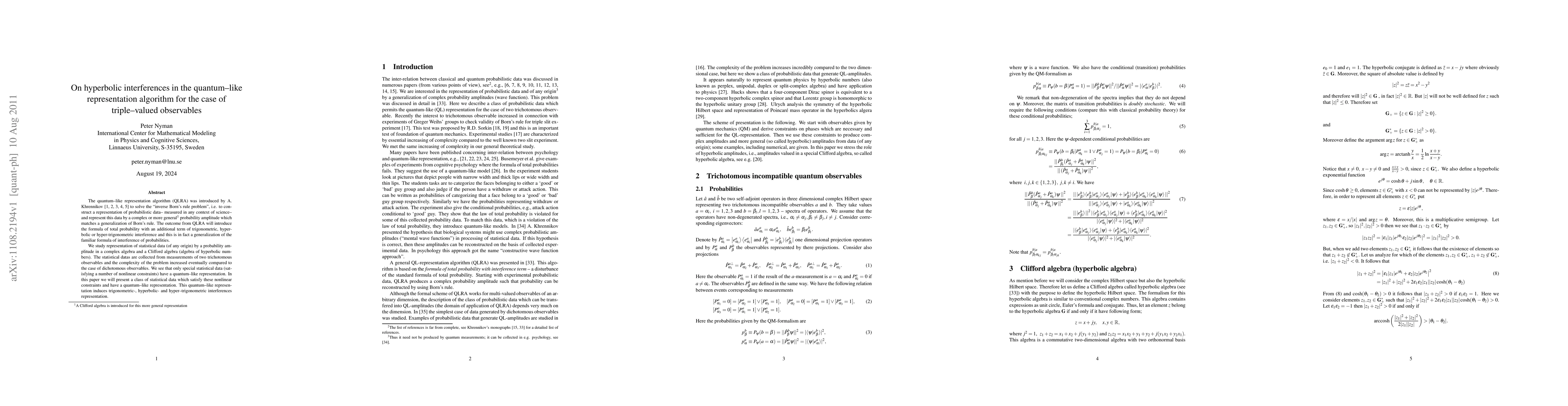 The quantum-like representation algorithm (QLRA) was introduced by A. Khrennikov \cite{K1,K2,K3,K4,K5} to solve the "inverse Born's rule problem", i.e. to construct a representation of probabilistic data - measured in any context of science - and represent this data by a complex or more general (A Clifford algebra is introduced for this more general representation) probability amplitude which matches a generalization of Born's rule. The outcome from QLRA will introduce the formula of total probability with an additional term of trigonometric, hyperbolic or hyper-trigonometric interference and this is in fact a generalization of the familiar formula of interference of probabilities. We study representation of statistical data (of any origin) by a probability amplitude in a complex algebra and a Clifford algebra (algebra of hyperbolic numbers). The statistical datas are collected from measurements of two trichotomous observables and the complexity of the problem increased eventually compared to the case of dichotomous observables. We see that only special statistical data (satisfying a number of nonlinear constraints) have a quantum-like representation. In this paper we will present a class of statistical data which satisfy these nonlinear constraints and have a quantum-like representation. This quantum-like representation induces trigonometric-, hyperbolic- and hyper-trigonometric interferences representation.
