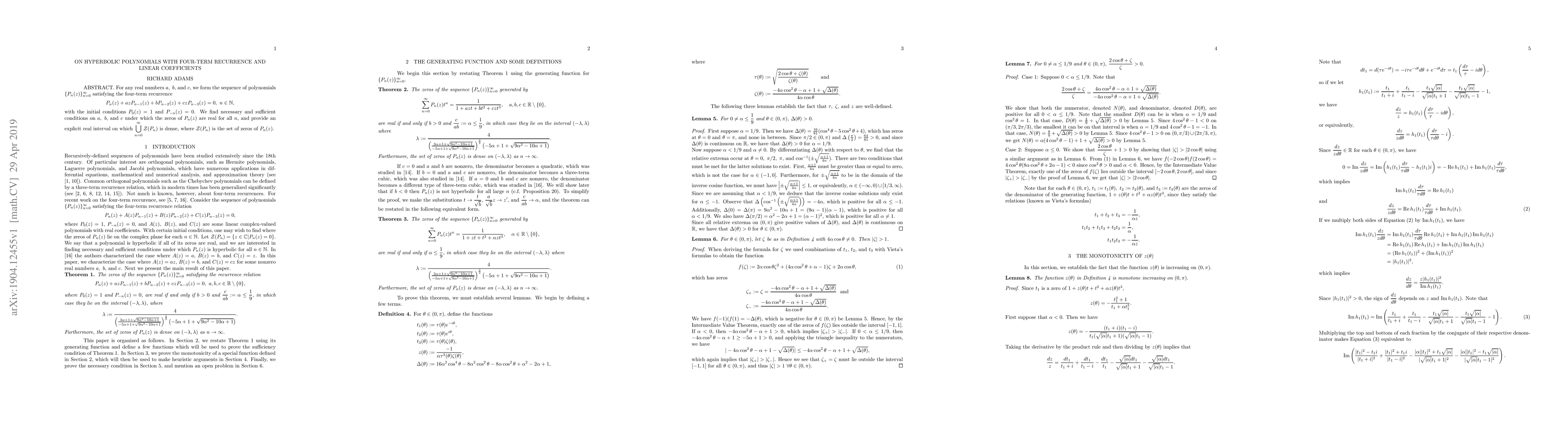 Researchers investigate a four-term recurrence relation for polynomials with linear coefficients, finding necessary conditions for real zeros across all n and an explicit interval where the union of zeros is dense.