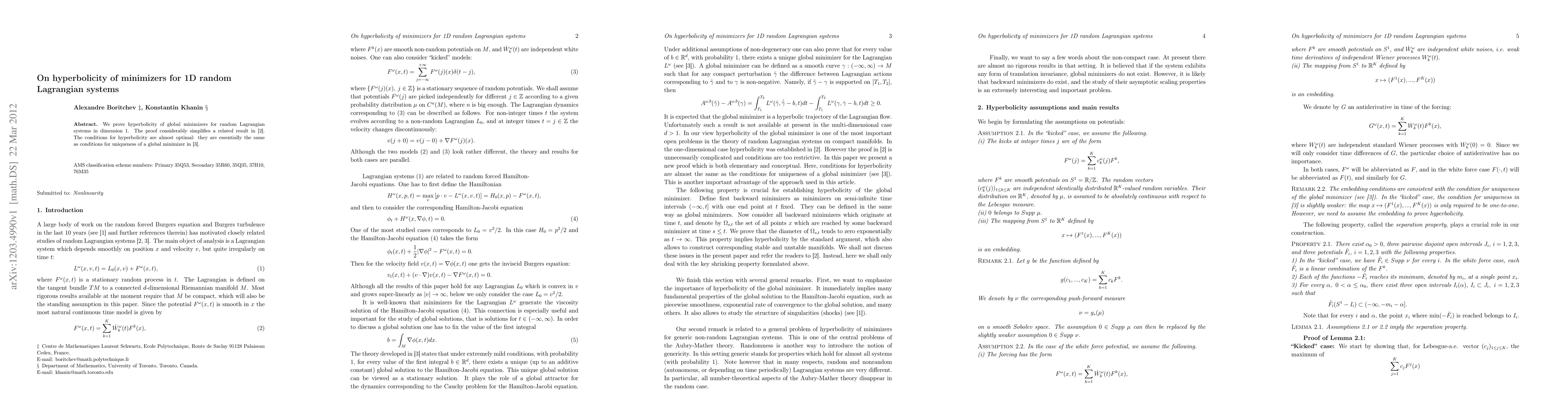 We prove hyperbolicity of global minimizers for random Lagrangian systems in dimension 1. The proof considerably simplifies a related result in [2]. The conditions for hyperbolicity are almost optimal: they are essentially the same as conditions for uniqueness of a global minimizer in [3].