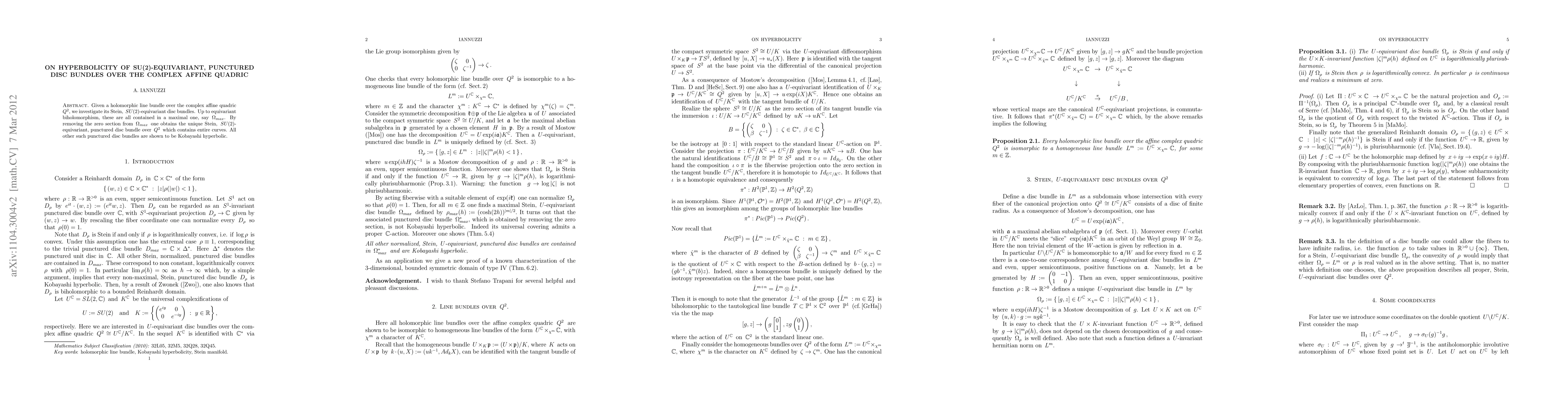 Given a holomorphic line bundle over the complex affine quadric $Q^2$, we investigate its Stein, SU(2)-equivariant disc bundles. Up to equivariant biholomorphism, these are all contained in a maximal one, say $\Omega_{max}$. By removing the zero section to $\Omega_{max}$ one obtains the unique Stein, SU(2)-equivariant, punctured disc bundle over $Q^2$ which contains entire curves. All other such punctured disc bundles are shown to be Kobayashi hyperbolic.